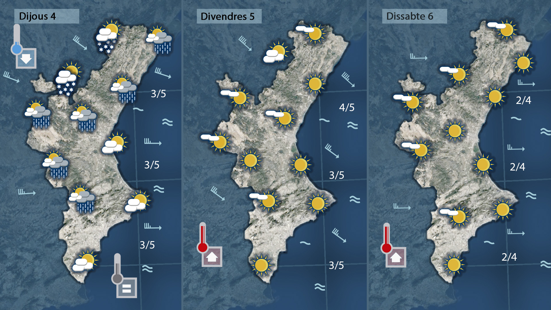 Els núvols es faran més compactes de cara a la nit deixant ruixats dèbils al nord in per l’interior i el descens tèrmic que es deixarà sentir de nord a sud podria deixar alguna volveta de neu a les muntanyes del nord.
