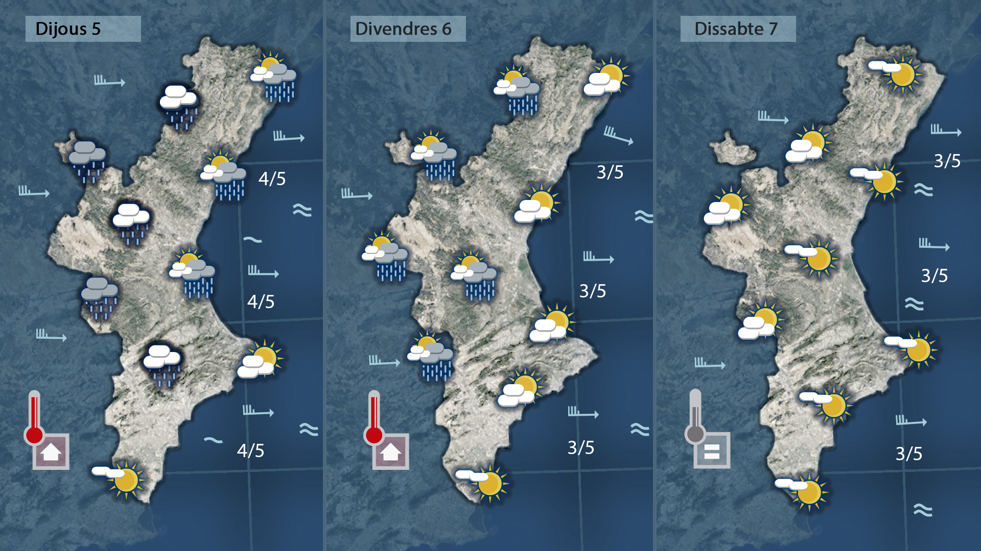 I per no perdre el costum la recta final d ela setmana també vindrà marcada pel ponent i per les nuvolades que avançant des de l’interior deixaran plugims més bé dèbils i temperatutres molt suaus que dijous tendiran a piujar de forma notable per quedar més fresques a partir de divendres
