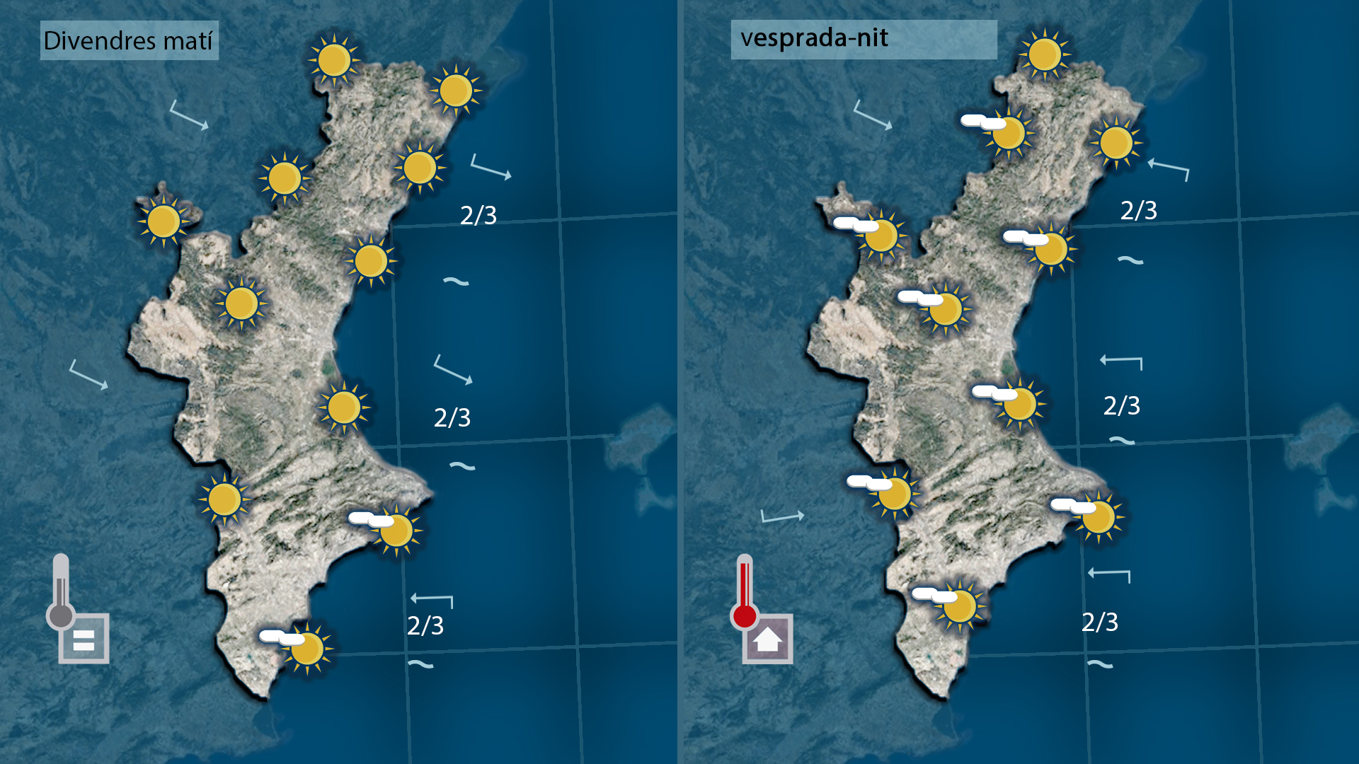 Hui divenfdres no tindrem queixa perquè núvols en vorem pocs i els que es deixen vore no seran productius i les tempertaures pujaran tant o més que les d’ahir