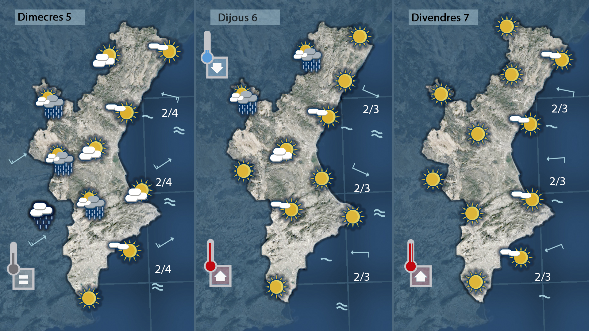 Dimecres, un front de núvols, s’obrira pas amb dificultat i a les acaballes del dia tindrem més núvols per l’oest anunciant una lleugera inestabilització de l’oratge entre que deixarà ruixats la matinada de dimecres a dijous