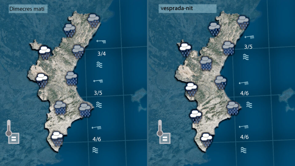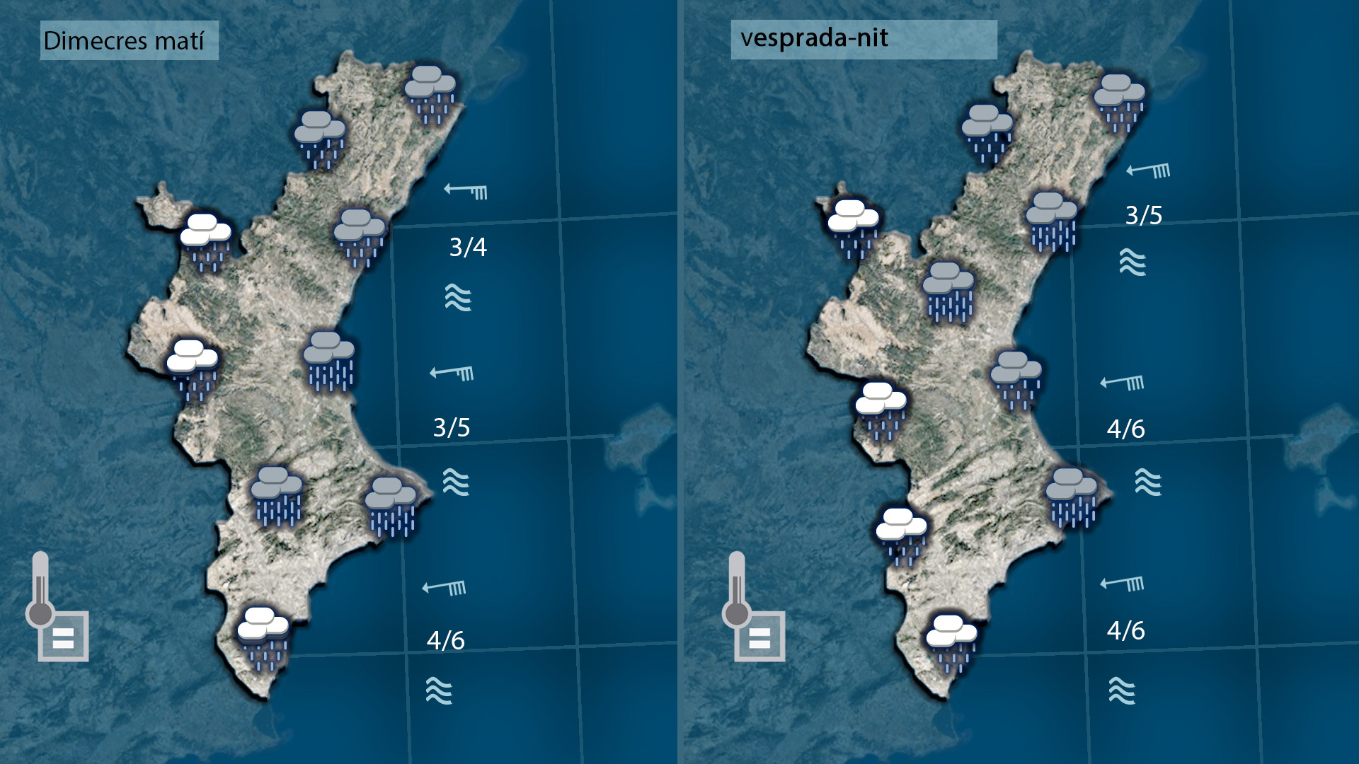 Demà dijous es manté l’avís i la probabilitat de pluges intenses durant bona part de la jornada. La diferència entre hui i demà dijous serà el desplaçament de les pluges més importants cap al nord de València i a Castelló