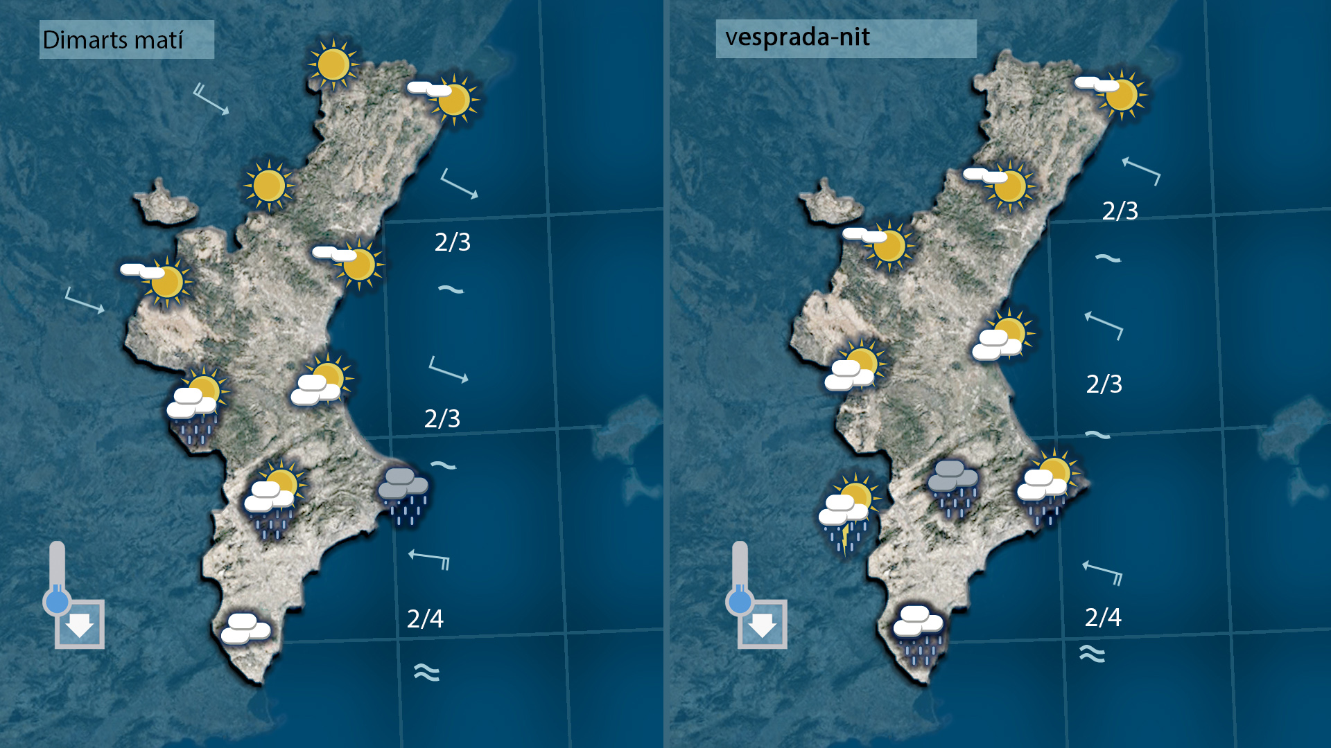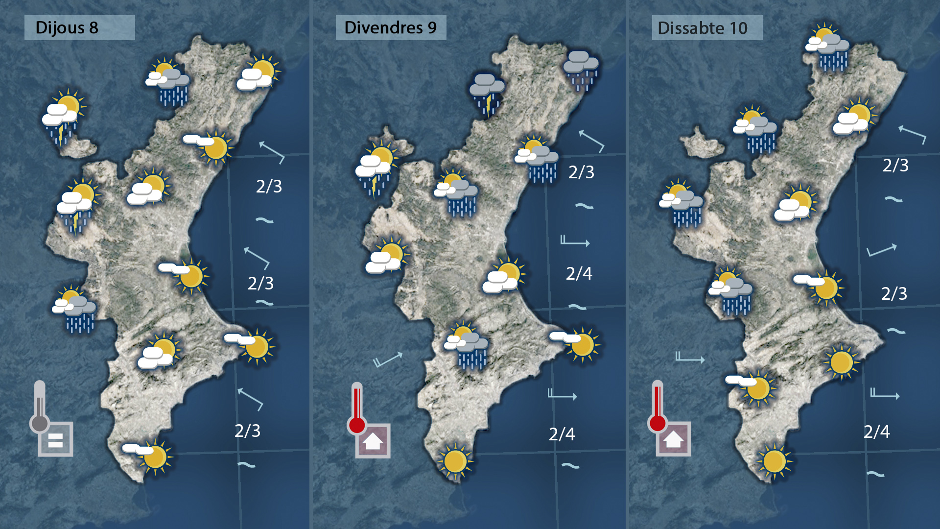 Farà més solal nord on el vent es deixarà sentir de mestral i oratge més inestable al sud amb ruixats dèbils de matí i un poc més intensos de cara a la vesprada i temperatures més biaxes per tot arreu tant de nit com de dia.