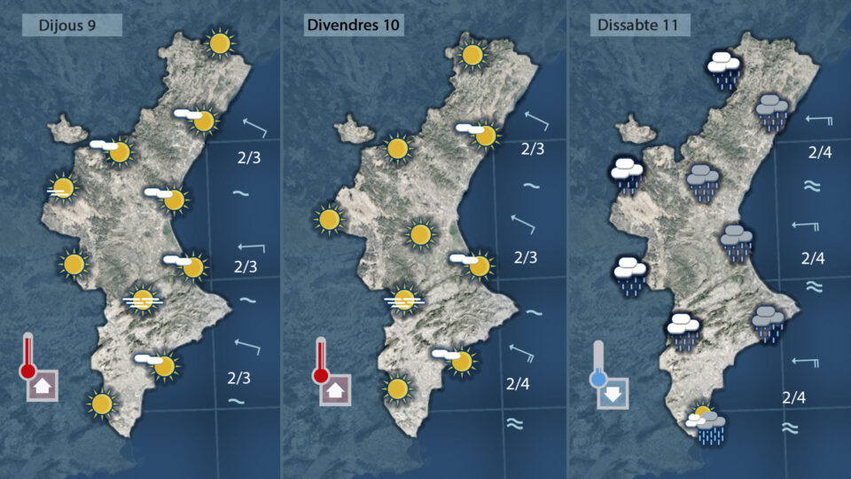 Hui serà un dia bàssicament assolellat i les temperatures es mantindran molt suaus. Potser l’ambient siga tèrbol però les temperatures seran suaus tant de dia com de nit amb valors més alts a l’interior que a la costa