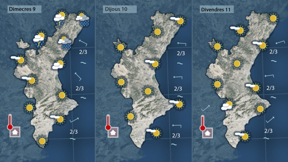 Dimecres també començarà gris i amb plugetes dèbils a la costa de la mitad nord de la Comunitat però cap a migdia la nuvolositat es desfarà deixant pas de nou al sol per tot arreu afavorint un ascens tèrmic que ens acompanyarà la recta final de la setmana.