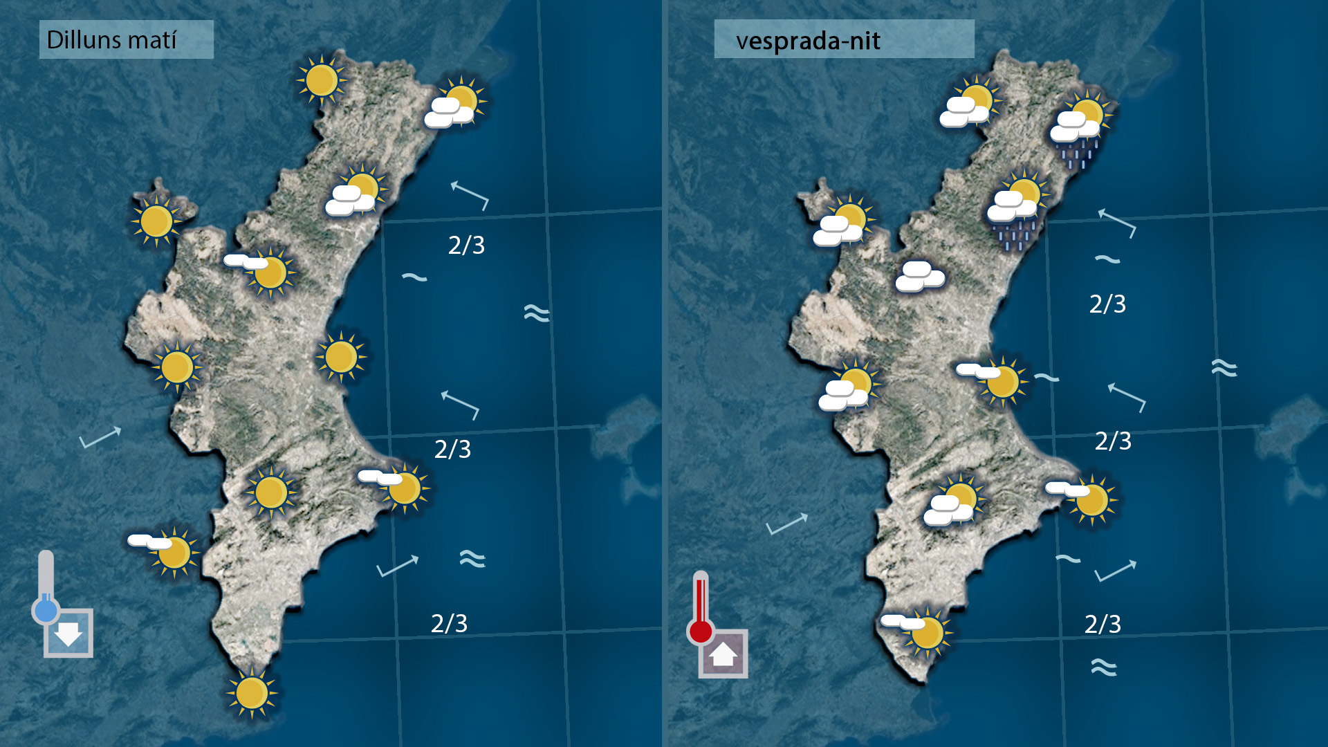 Dimrcres serà un dia gris i plujós però pense que a poqueta nit els núvols comen´çaran a desfer-se i dijous podrem disfrutar de nou del sol i de temperatures més altes, i per al cap de setmana previ a les Falles no tenim bones notícies perquè el llebeig de divendres anunciarà forts vents de mestral per a dissabte (l’enemic principal dels fallers tot just els dies claus de la plantà)