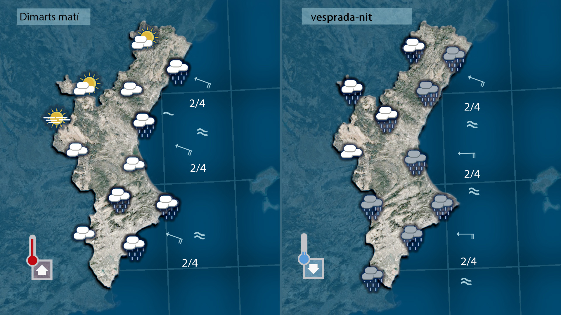 L’ambient era més fresc este matí símplement pel fet d’ahver quedat el cel lliure de núvols durant la nit i matinada. A migdia notarem com el sol condeix un poc m´rs i pugen les temperatures tot i un ayugment dels núvols que podrien deixar ruixats dèbils al litoral de Castelló