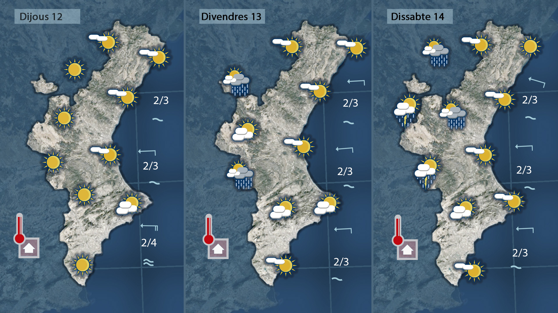 Dia rere dia aniran pujant les temperatures dijous, divendres, dissabte…Només caldrà estar un poc atents a les tronades que la vesprada-nit de divendres i dissabte podran afectar les terres de l’interior