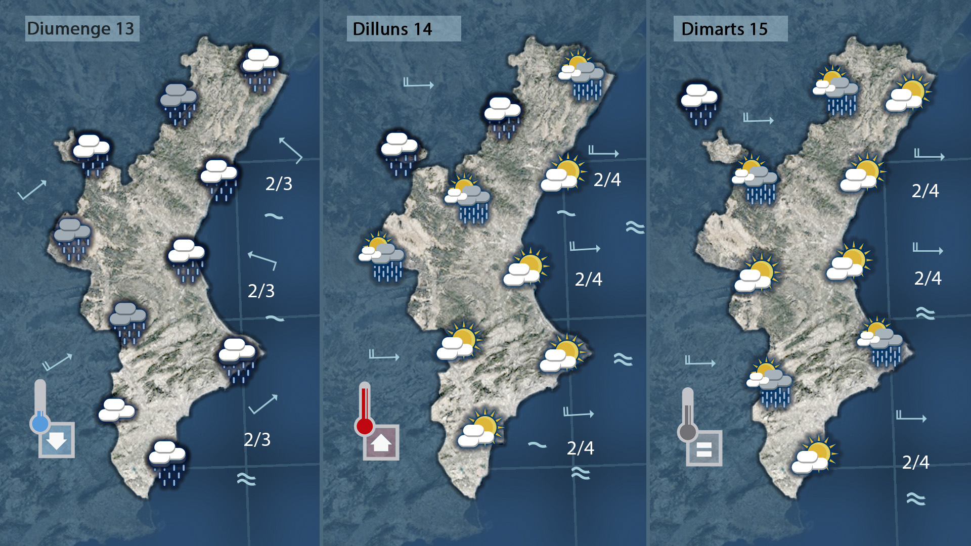 El cel estarà carregat de núvols des de primera hora i cap a mig matí podran registrar-se pluges dèbils a l’hora que es reforça el vent de xaloc i de llevant cap al sud la qual cosa afavorirà que les pluges es facen més generals amb el pas de les hores a la mitad sud de la Comunitat