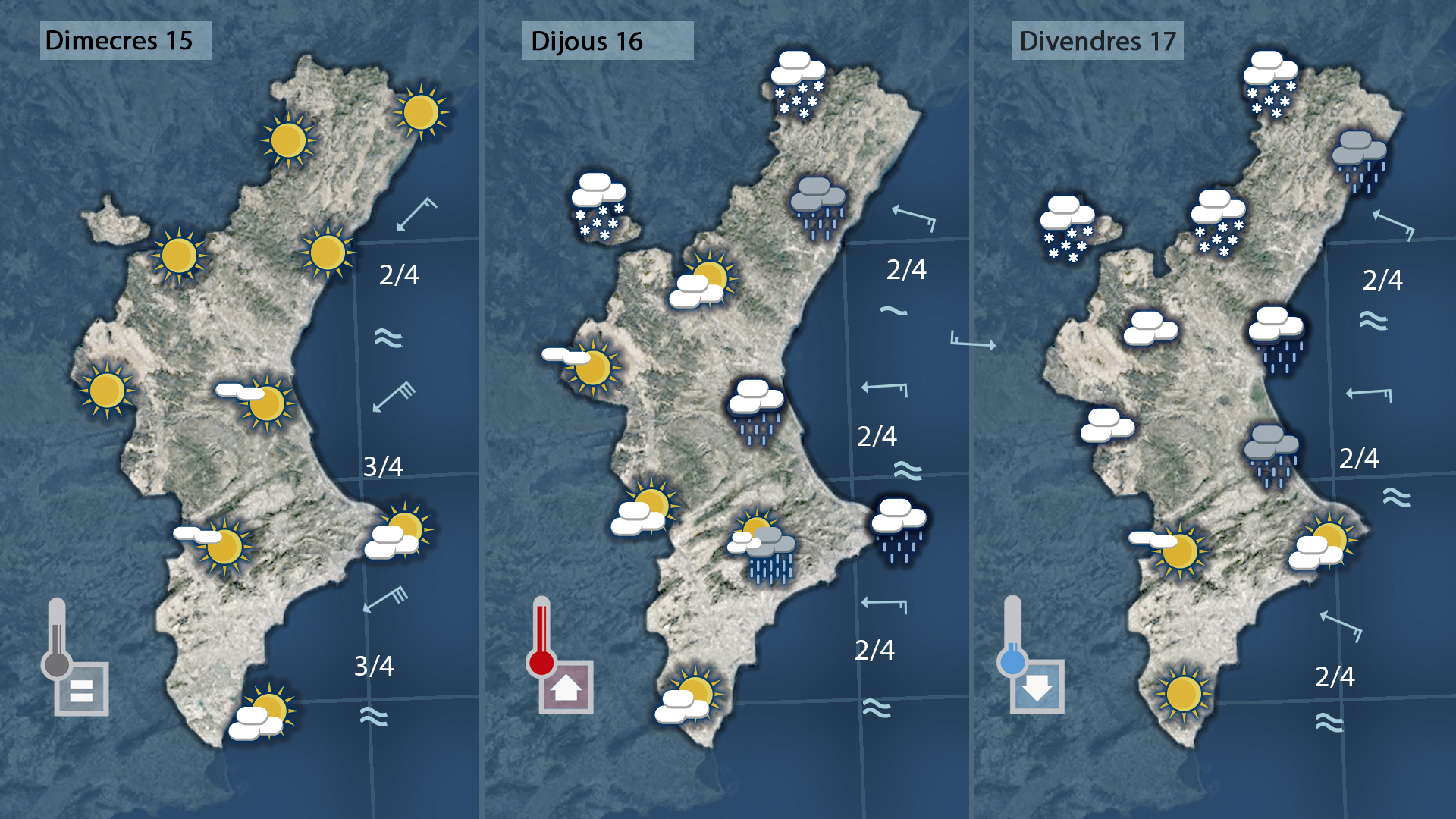 Mestral al nord amb fred i sol i gregal al sud amb núvols passaajent-se front a la costa a la costa que podran deixar ruixats a la mar `però que de refilada podrien tocar punts de la costa alacantina.