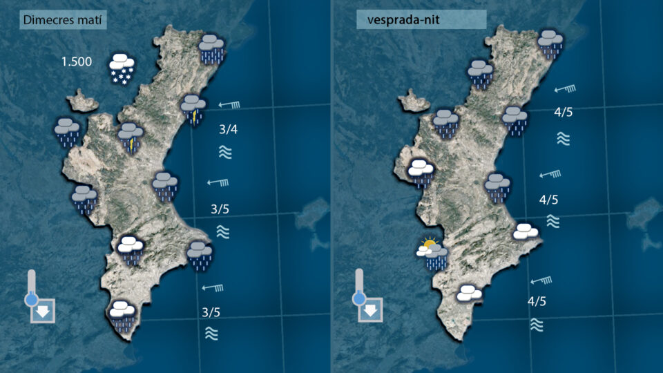 Demà també caldrà seguir els avisos per pluja perquè localment encara plourà amb intensitat moderada o forta sobretot al lotoral nord de Cadstyelló i al del sud de València i nord d’Alacant encara que a poc a poc la inestabilitat i la pluja aniran amenys amb el pas de les hores.