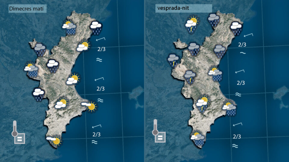 El núvols seran més bundants de cara a la nit generalitzant-se le spluges que localment seran moderades i destacaran també per la seua persitència