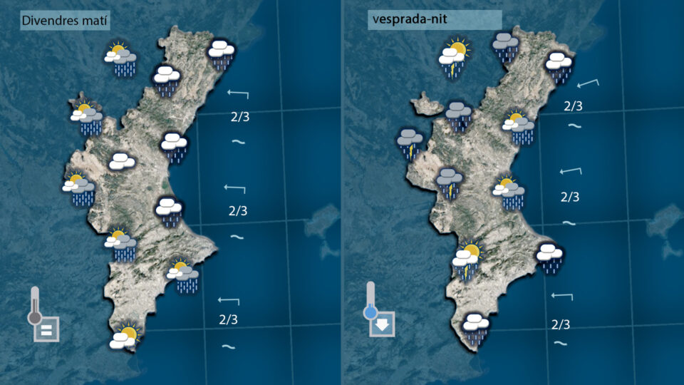 Hui serà l’últim dia de pluges que a més podran ser intenses i tempestuoses a bona part del nord i de l’interior on esta vesptrada els núvols convectius es passajaran actius. Podan deixar ruixats de més de 20 litres en poc més d’un hora amb llamps, trons…i potser la mala companyia de la pedra.