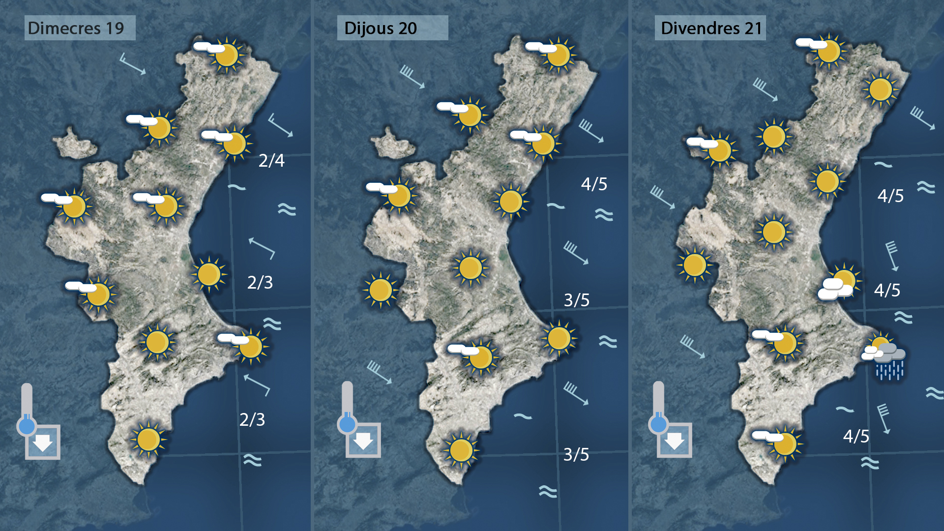 Demà dimarts encara notarem més el fred perquè les temperatures continuaran baixant i el vent accentuarà la sensació de fresca en bufar moderat fins a migdia. Vorem pocs núvols al cel i només cap a migdia podrà passejar-se algun núvol més actiu al litoral del nord d’Alacant