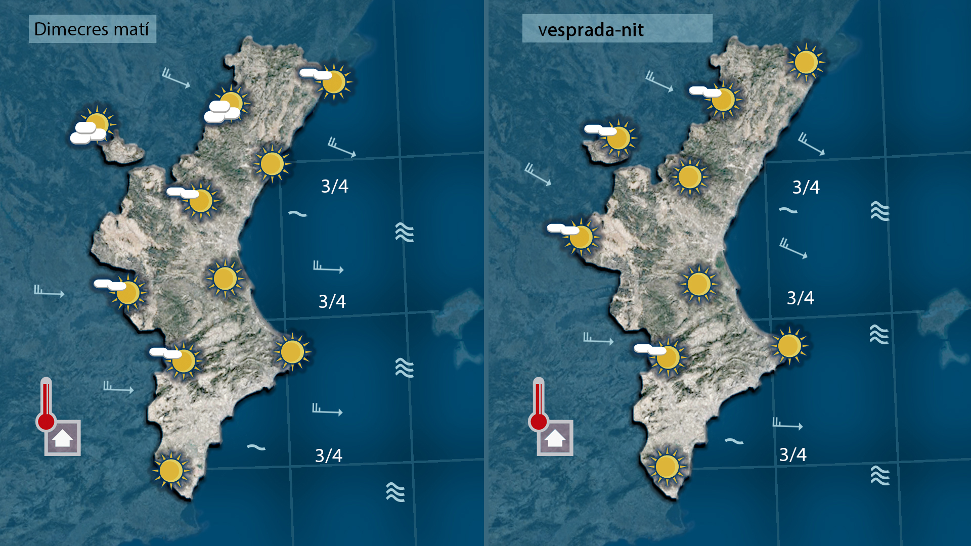 Avisos per ponent a l’interior de València i a l’interior nord d’Alacant. Vent de ponent entre moderat i fort que deixarà o mantindrà altes les temperatures i pas de núvols sense cap conseqüència quant a pluja