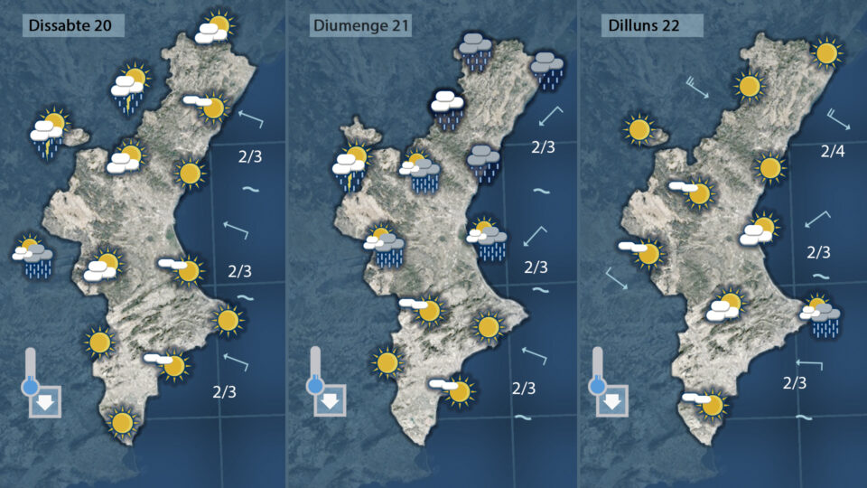 Diumenge s’acaba l’estiu amb un oratge més fresc, més variable i més insegur amb ruixats que afectaran la mitad nord de la Comunitat i la tardor començarà dilluns amb mestral i temperatures més baixes només amb una xicoteta probabilitat de tronades al sud de València i al nord d’Alacant a primera hora