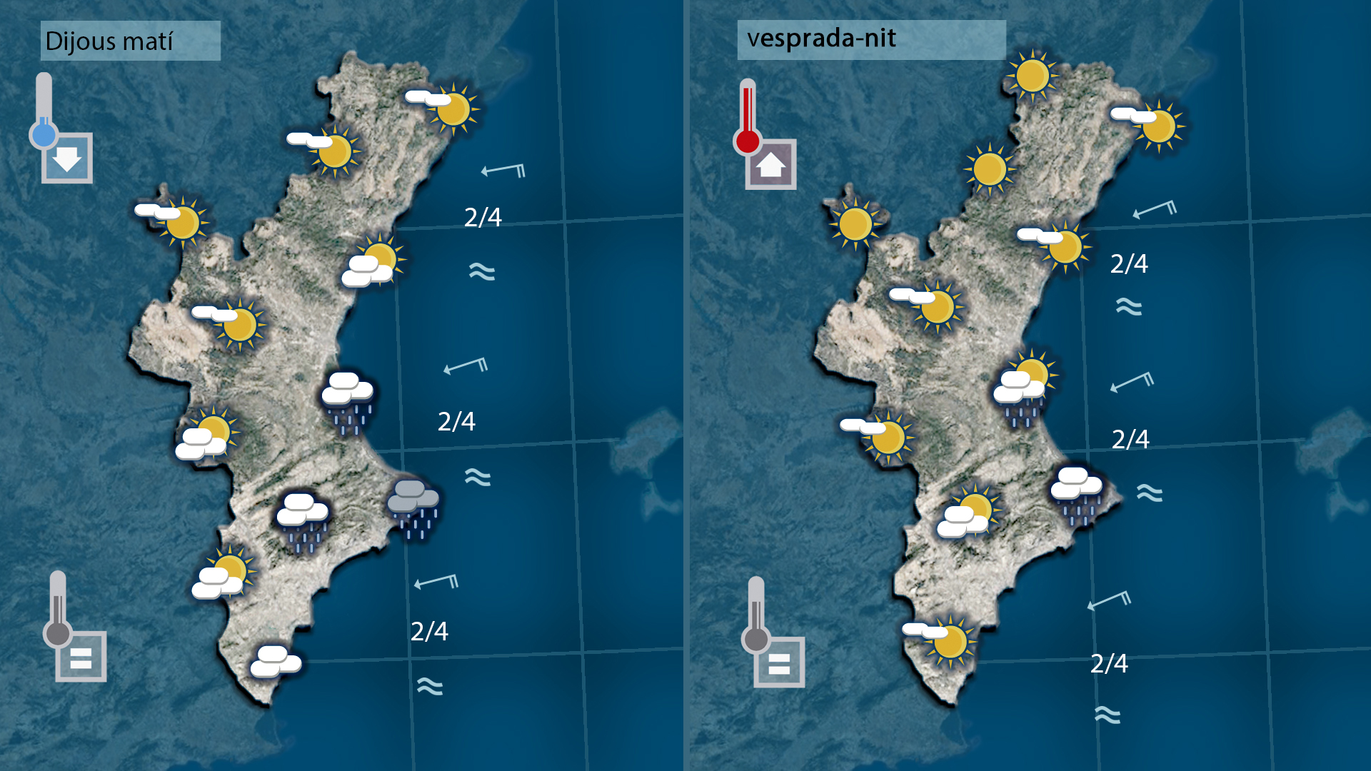 Comencem el dia sense avisos meteorològics i amb ruixats puntuals que encara poden afectar les zones més costaneres del sud de València i del nord d’Alacant però amb el pas de les hores el sol s’imposarà per tot arreu i les temperatures quedaran un o dos graus més altes al centre de la jornada.