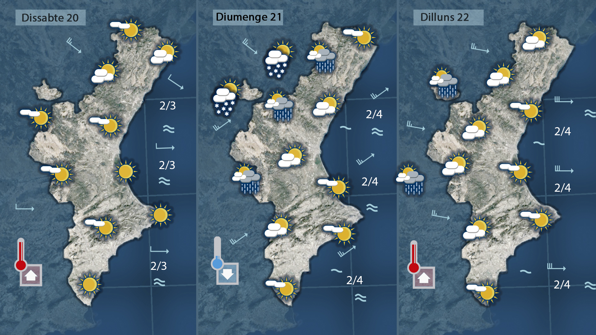 Diumenge donarem la benvinguda oficial a l’hivern quan passen 3 minuts de les 4 de la vesprada amb un ambient més fresc i ruixats abançant des de l’interior a partir de migdiani una nova borrasca de Nadal que vindrà marcada pel vent de ponent.