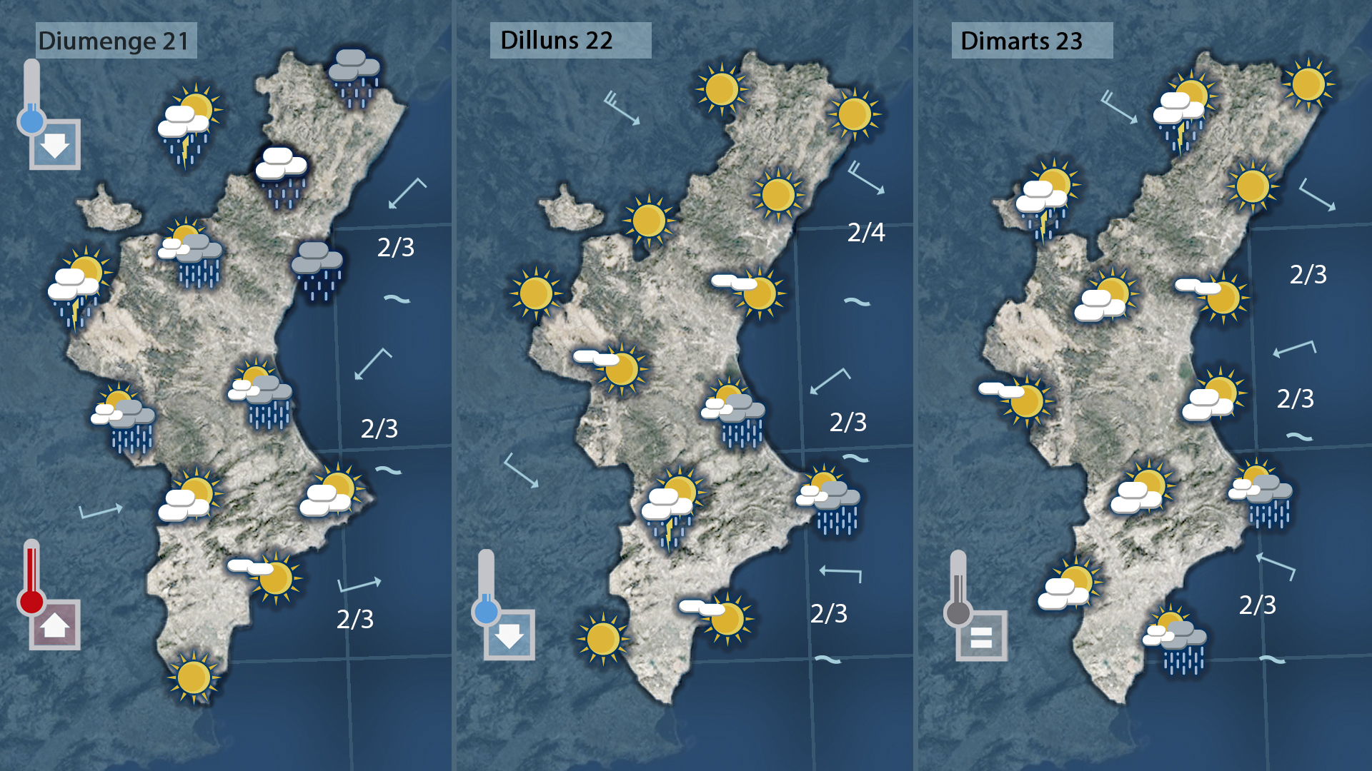 Coincidint amb l’inici oficial de la tardor arribarà eixa masa d’aire més freda amb mestral al nord i gregal al sud deixant les temperatures notablement més baixes i inestabilitzant l’atmosfera.