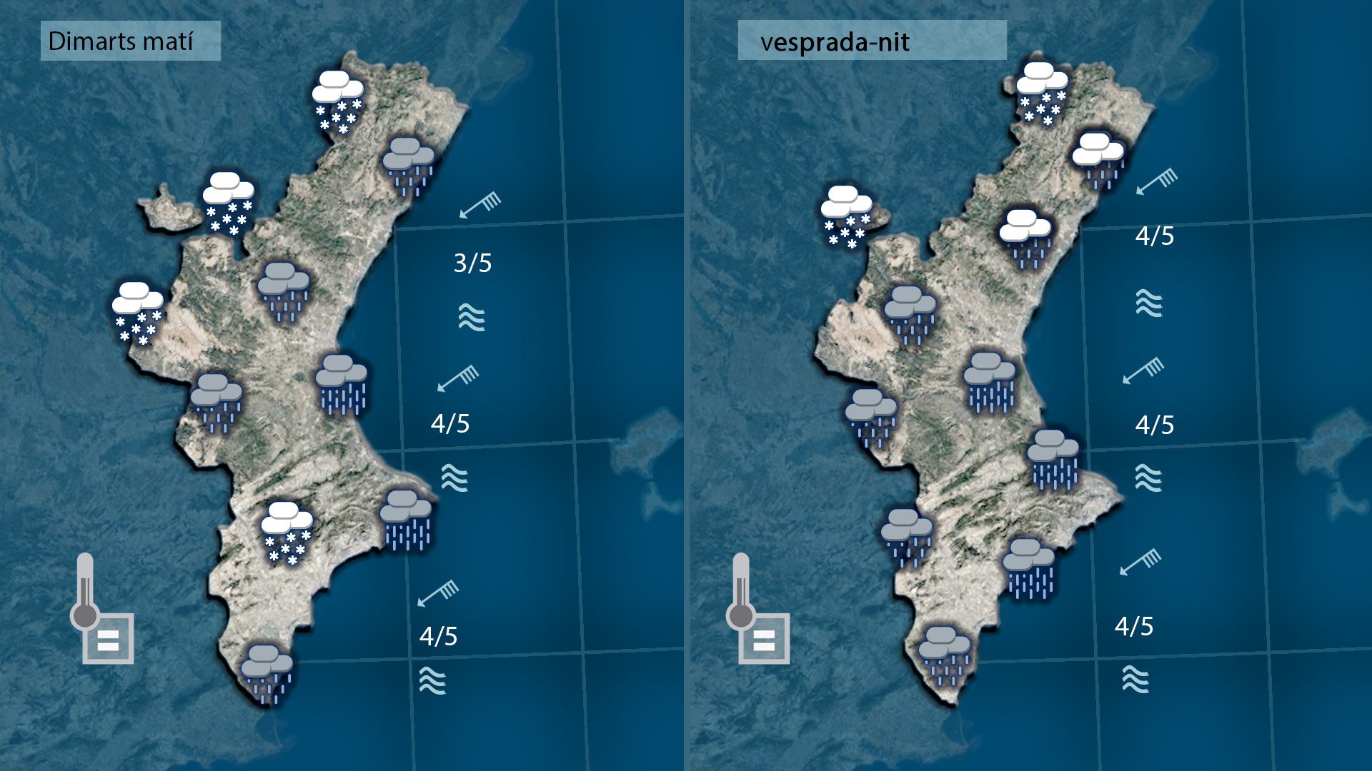 La borrasca Harry passarà ràida però pot ser intensa i deixar pluges generals i intenses al sud de València i al nord d’Alacant i neu en abundància al nord de la Comunitat