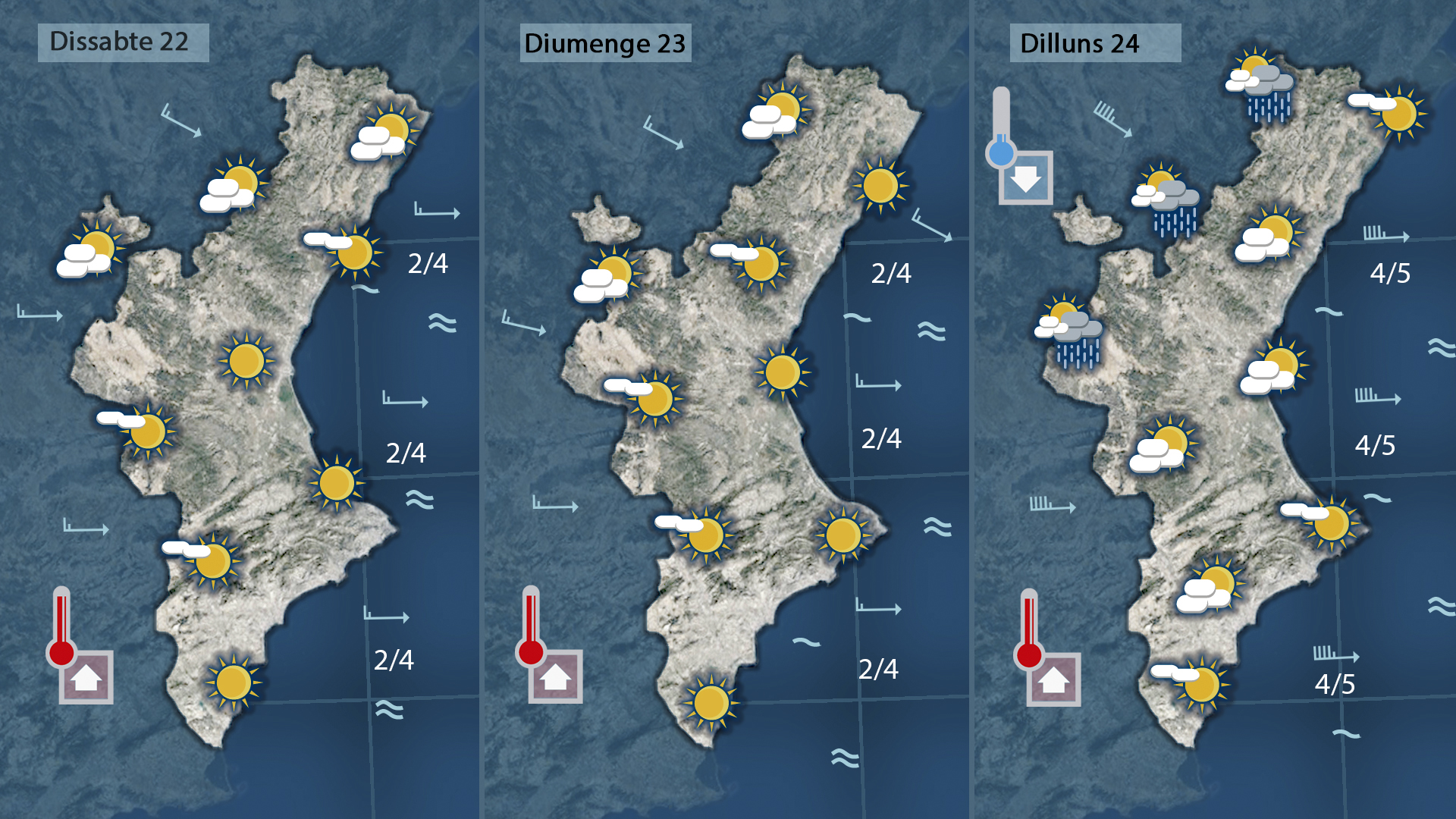 El mestral girarà dissabte a ponent pur i això afavorirà que les temperatures puguen recuperar-se cap a migdia. Diumenge també farà ponent i de nou serà un poc més càlid o menys fred i dilluns es reforça i no descartem que puga caure algun ruixat al nord.