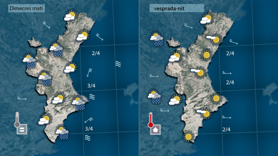 I no descarte que encara puga ploure fins a mig matí al temps que notem com comença a bufar el ponent i a escampar la nuvolositat. No obstant, a poqueta nit entraran núvols més actius des de l’interior que deixaran ruixats dèbils i dispersos. Les temperatures mostraran una clara tendència a plujar