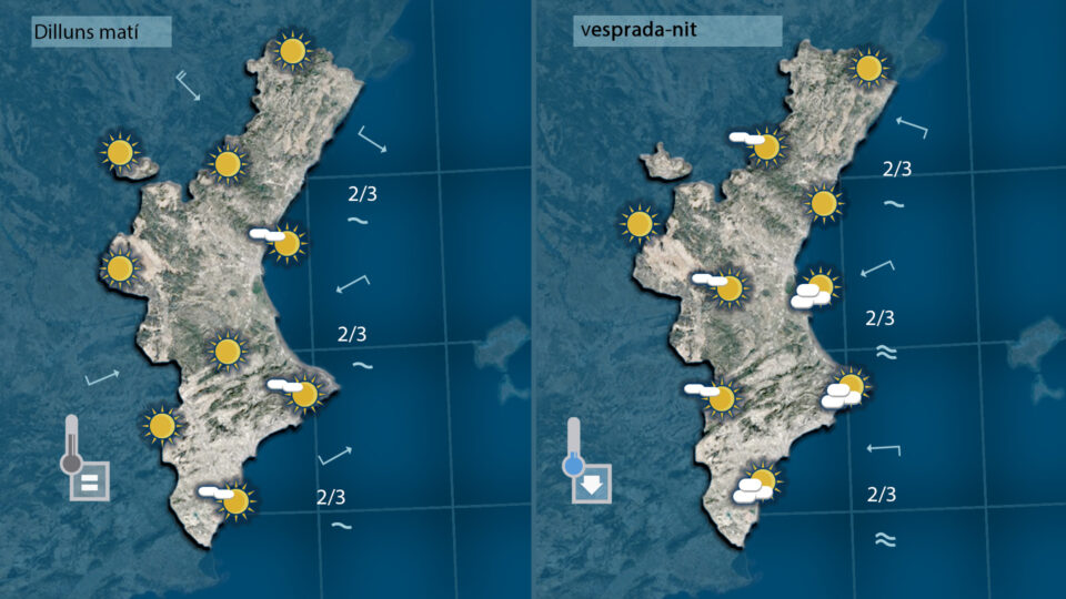 Hui encara patirem les seqüeles del cap de setmana perquè a la mitad sud encara es deixarà sentir el llebeig. De tota manera notarem i agrairem un lleuger descens tèrmic respecte al cap de setmana perquè el vent acabarà imposant-se de llevant iniciant-se un desitjat descens tèrmic