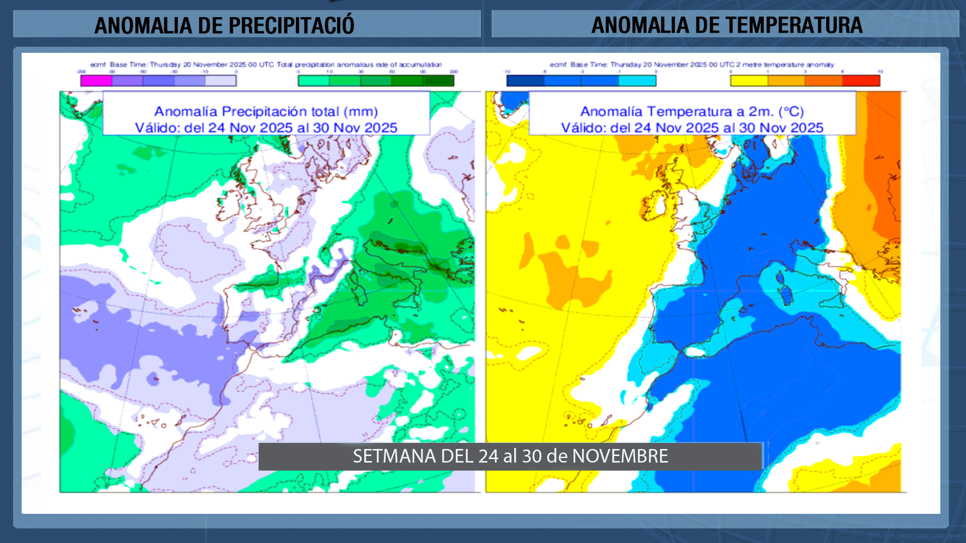 Una setmana on només cal esperar que ploga al Cantàbric (color verd al mapa) amb temperatures per davall dels valors normals per l’època…o siga que continua l’hivern.