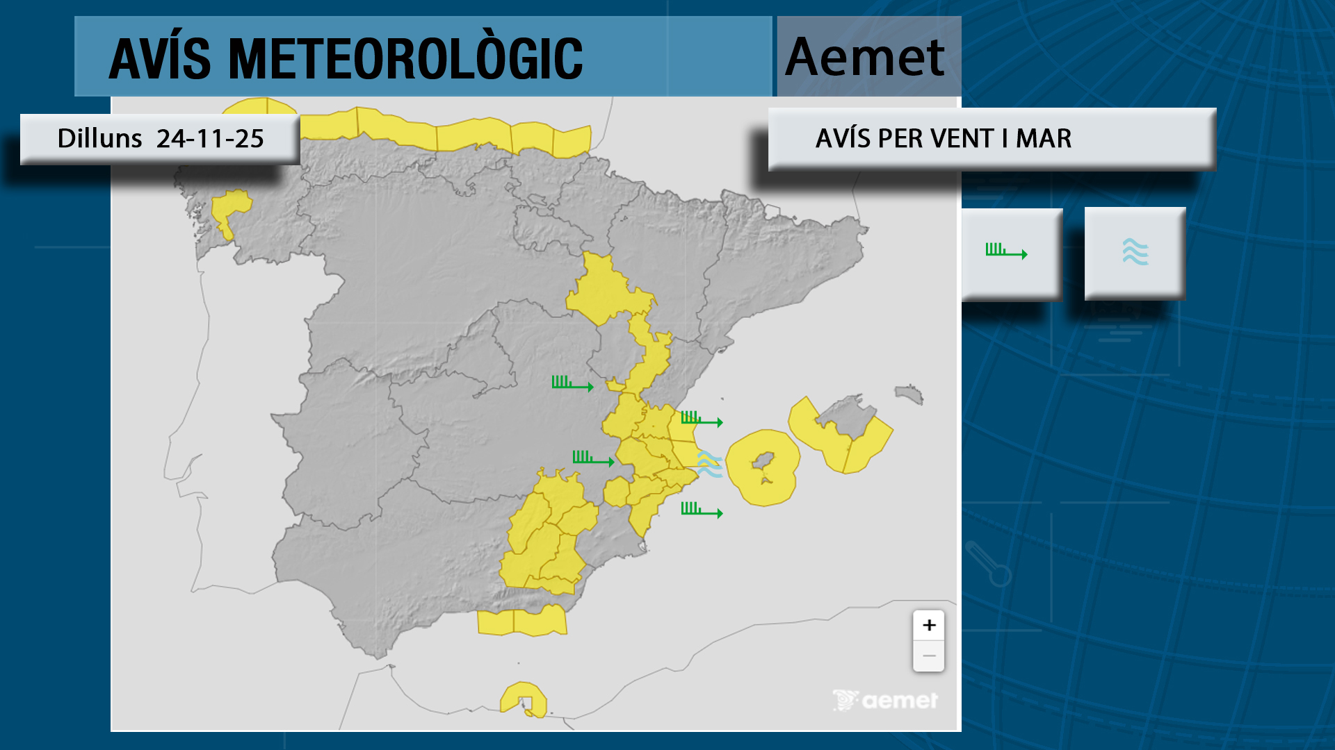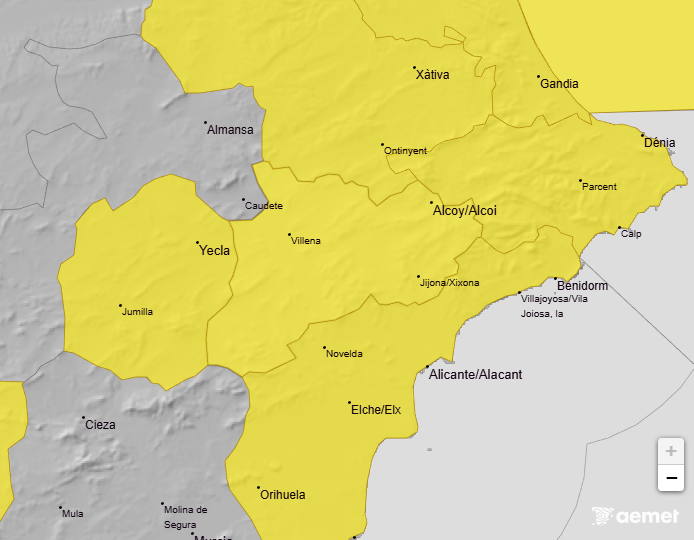 L´Oratge 24/11/2025: Avís groc al litoral sud i a l’interior d’Alacant per forts vents superiors als 70 km/h.
