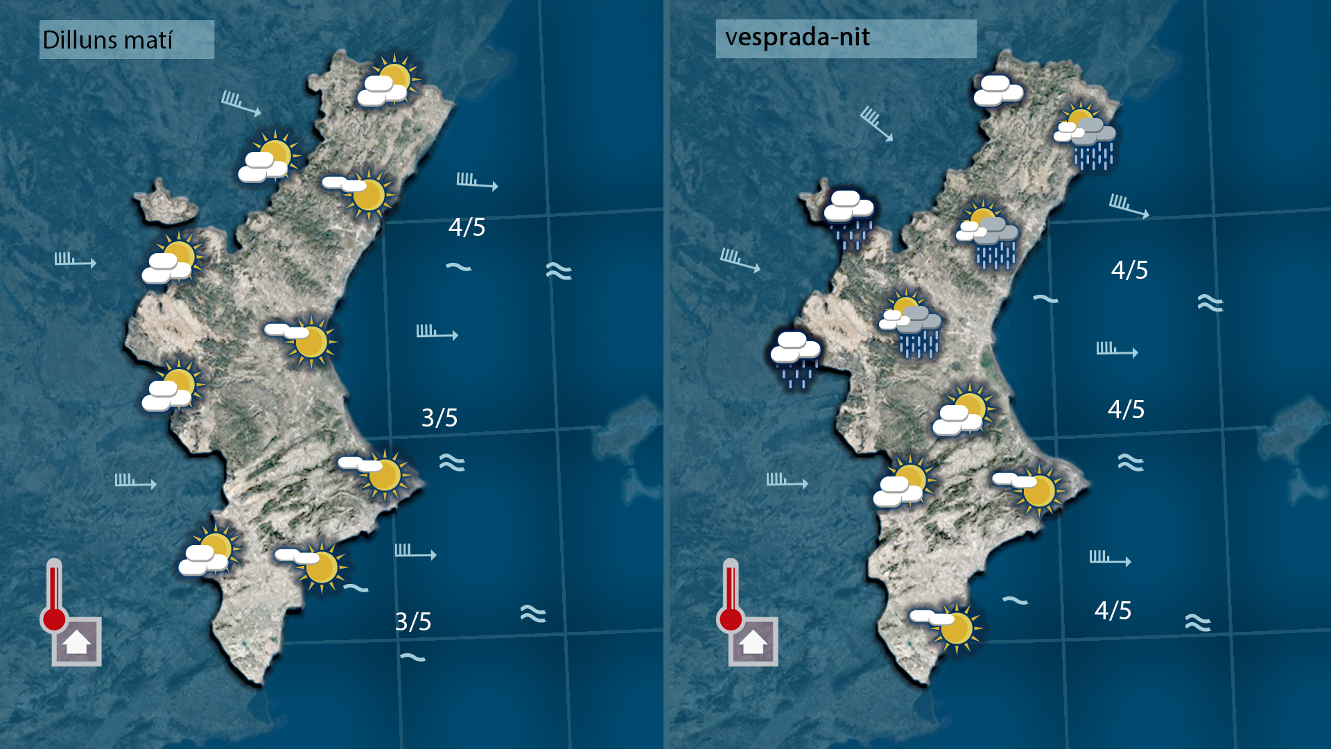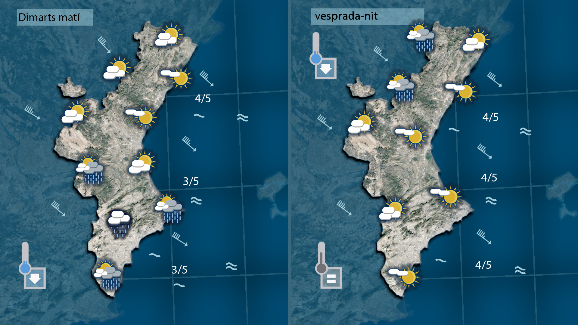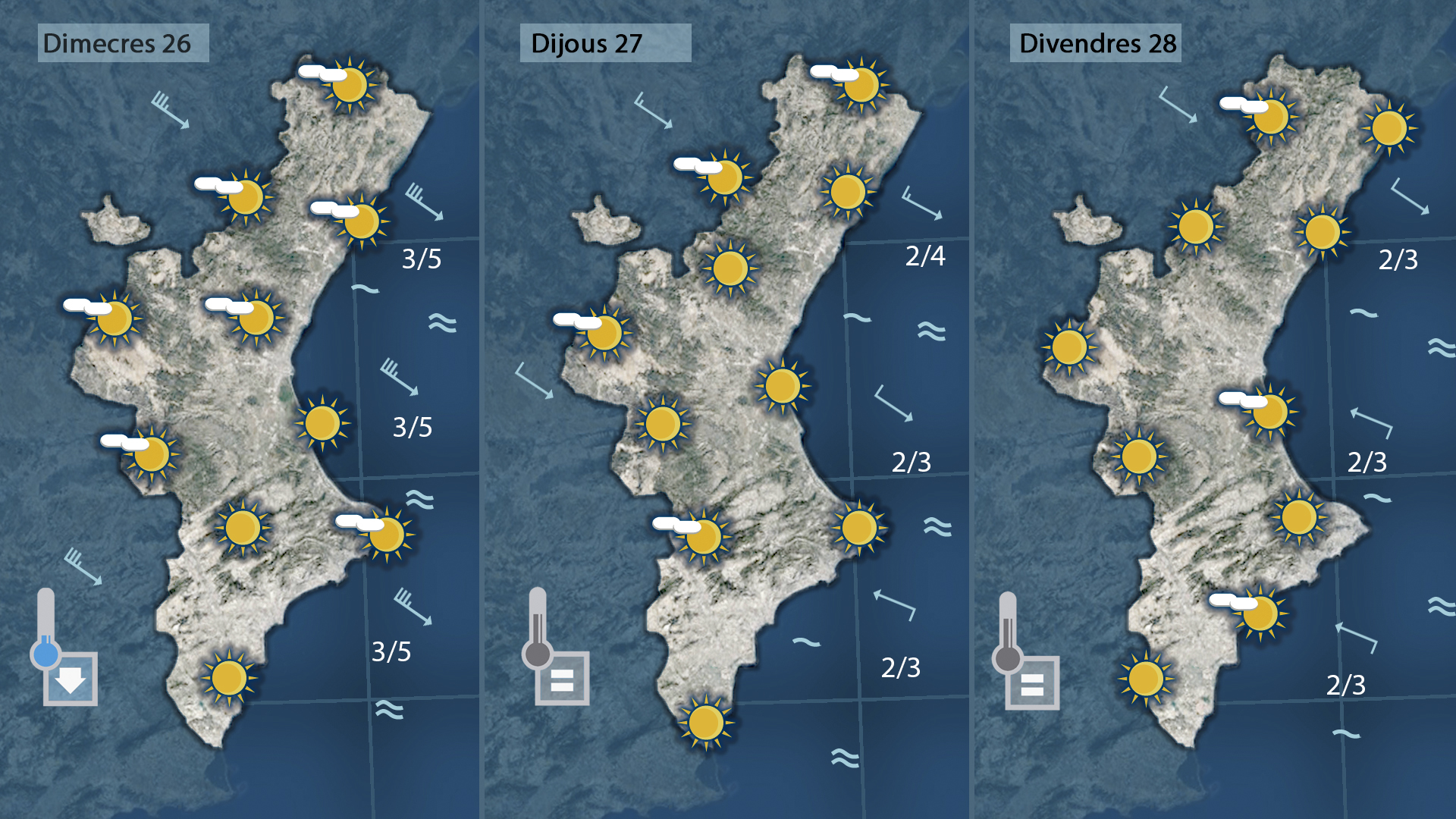 Durant la nit i matinada el ponent tornarà a girar un poc al nord bufant de nou de mestral i afectant les temperatures que començaran a baixar al nord i per l’interior des de primera hora. a la costa i al sud l’ambient es mantindrà suaus amb temperatures semblants a les de hui.