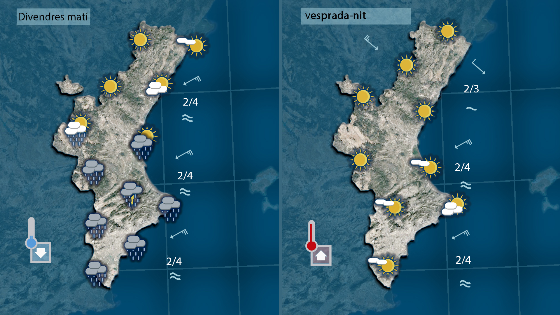 Comencem el dia pendents dels ruixats que poden afectar el sud de la Comunitat fins a les 8 o les 9 del matí però amb el pas de les hores els núvols aniran escampant i el sol acabarà imposant-se per tot arreu.