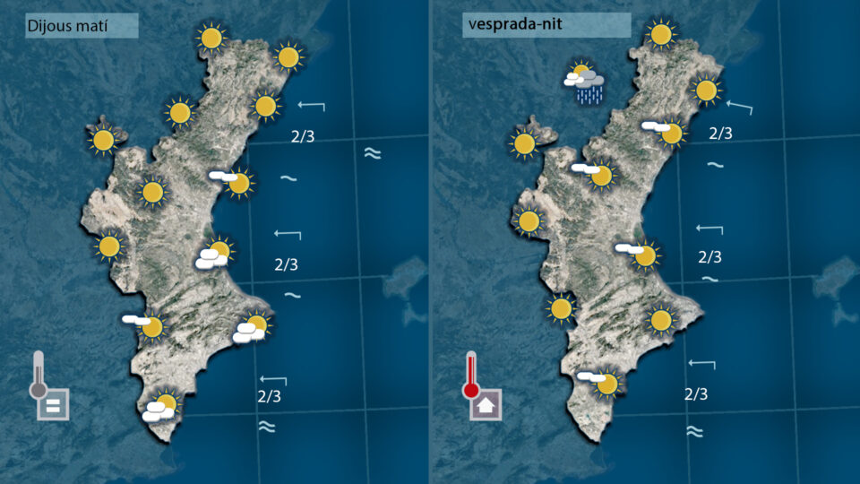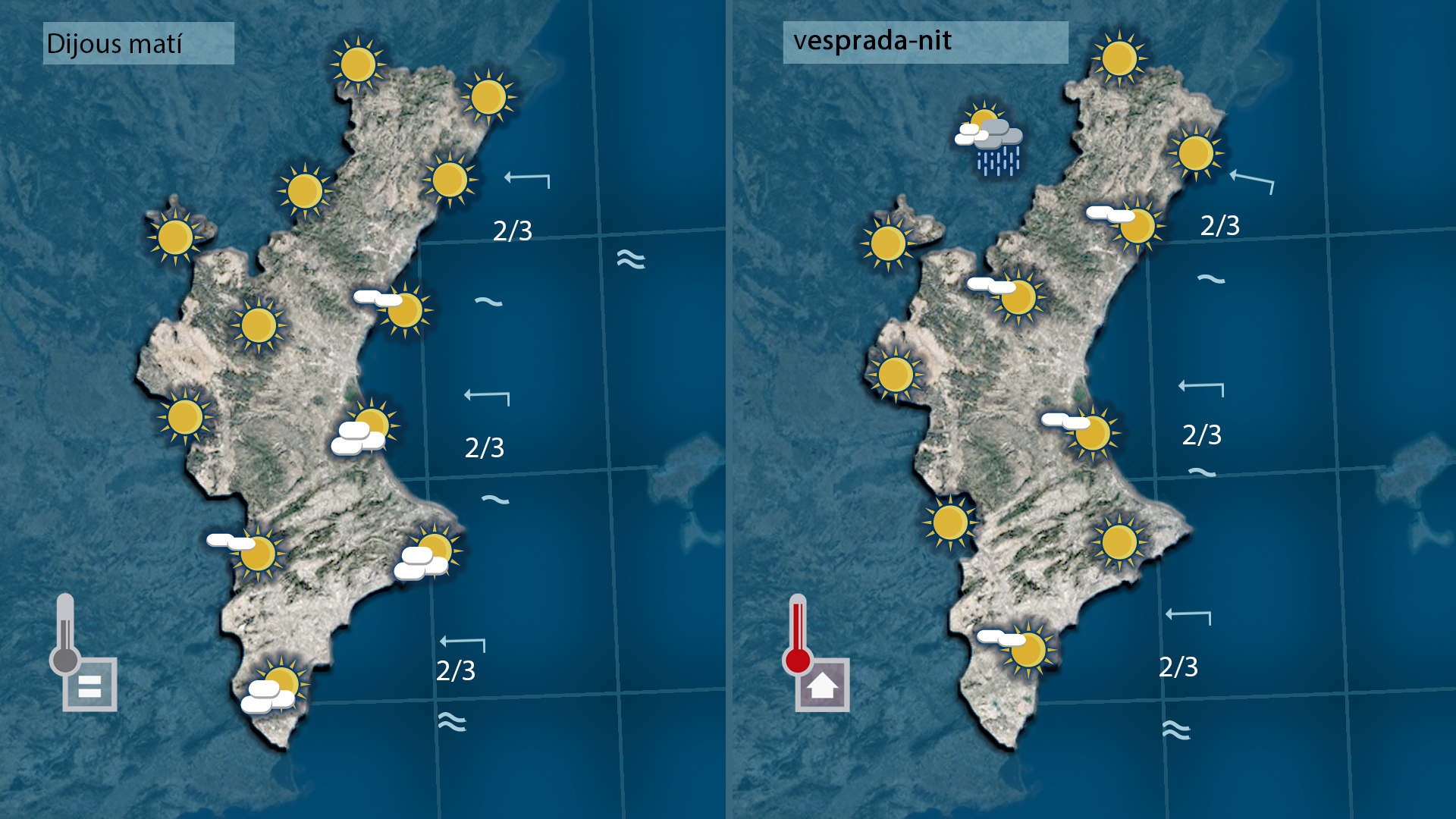 De moment per a hui no cal destacar massa canvis. Els núvols baixos seran els protagonistes a la costa i al centre en començar el dia i de vesprada podrà caure alguna gota entre Terol i Castelló.