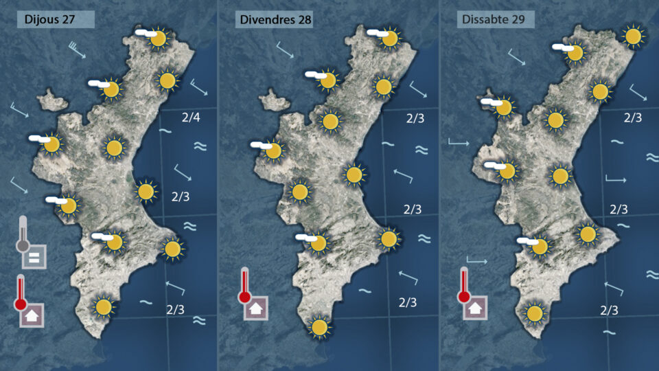 Serà dijous quan encalme el vent tot i que a primera hora encara es deicxarà sentir al nord. Divendres bufarà fluix de mestral al nord i de xaloc al centre i al sud i el cap de setmana començarà amb ponent fluix i temperatures més altes. Tempesratures que des de dijous hauiran estat pujant lentament
