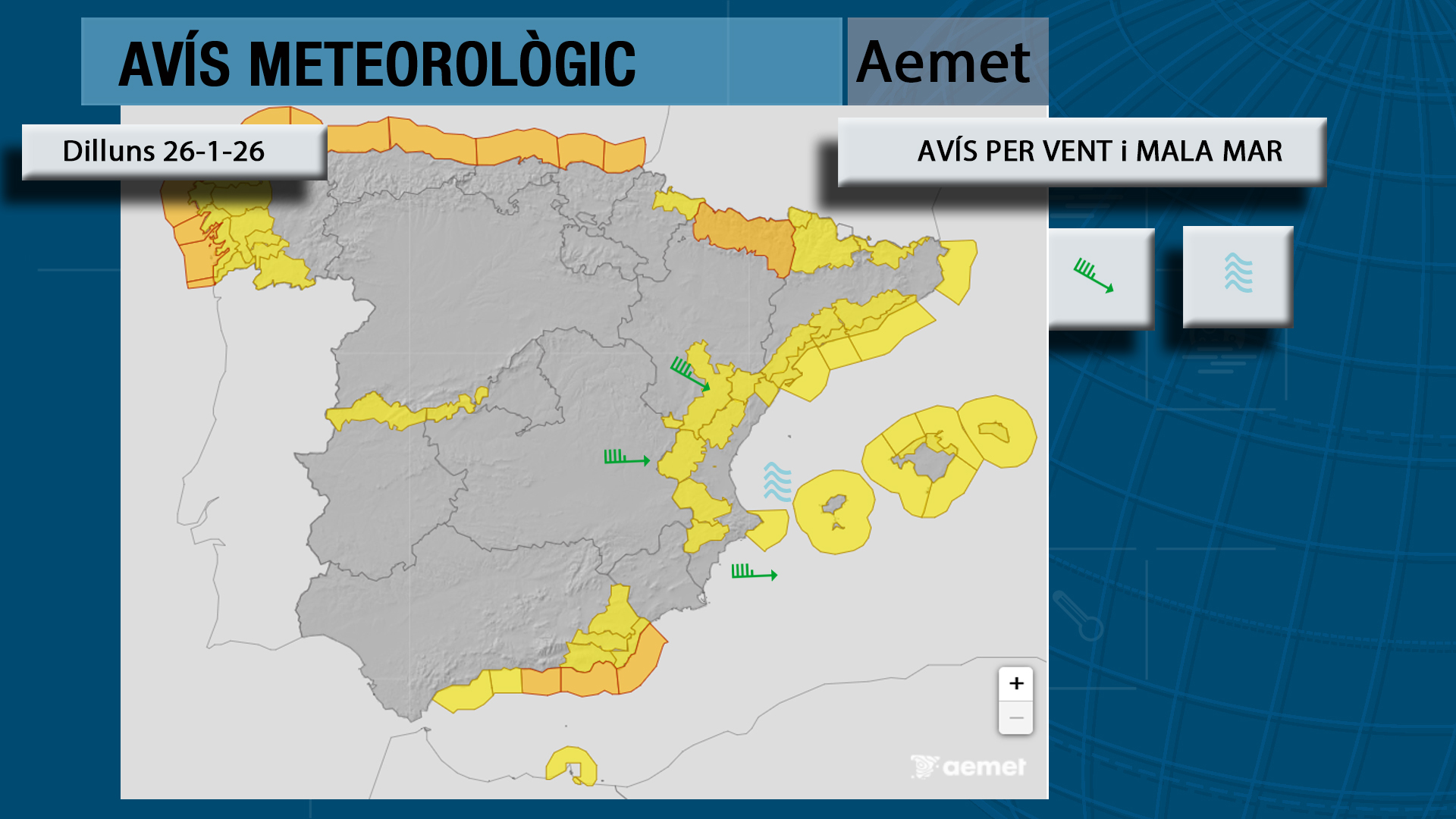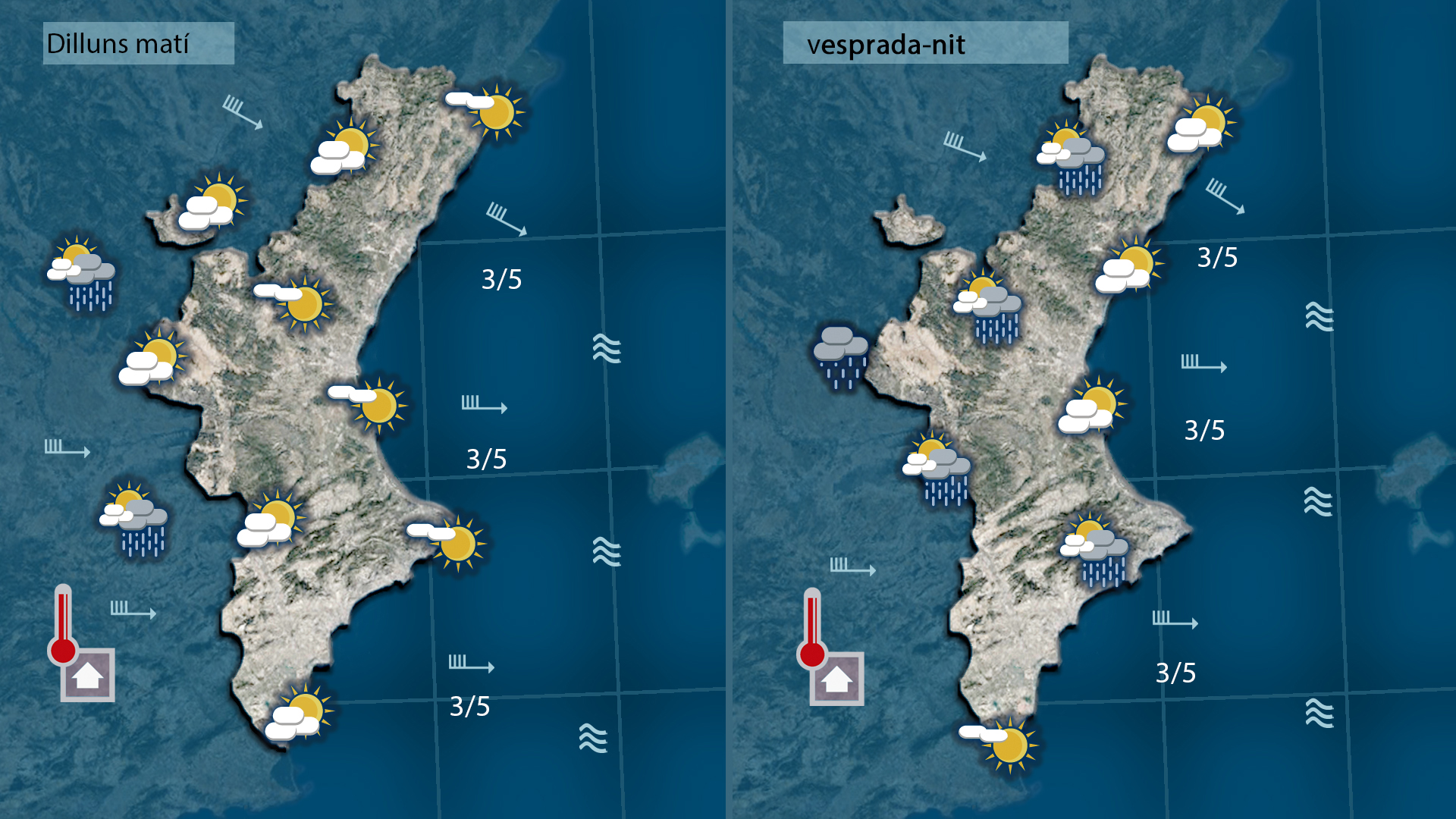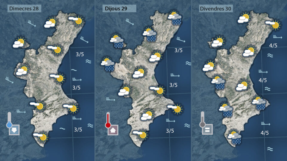 Cal tindre paciència amb el vent perquè no porta compte de parar, ni tant sols de perdre un poc de força…l’únic consol serà que des de hui mateix notarem que no es tan fred i fins i tot podem parlar d’un notable ascens tèrmic si comparem les temperatures que es registraran hui amb les que hem tingut el cap de setmana.