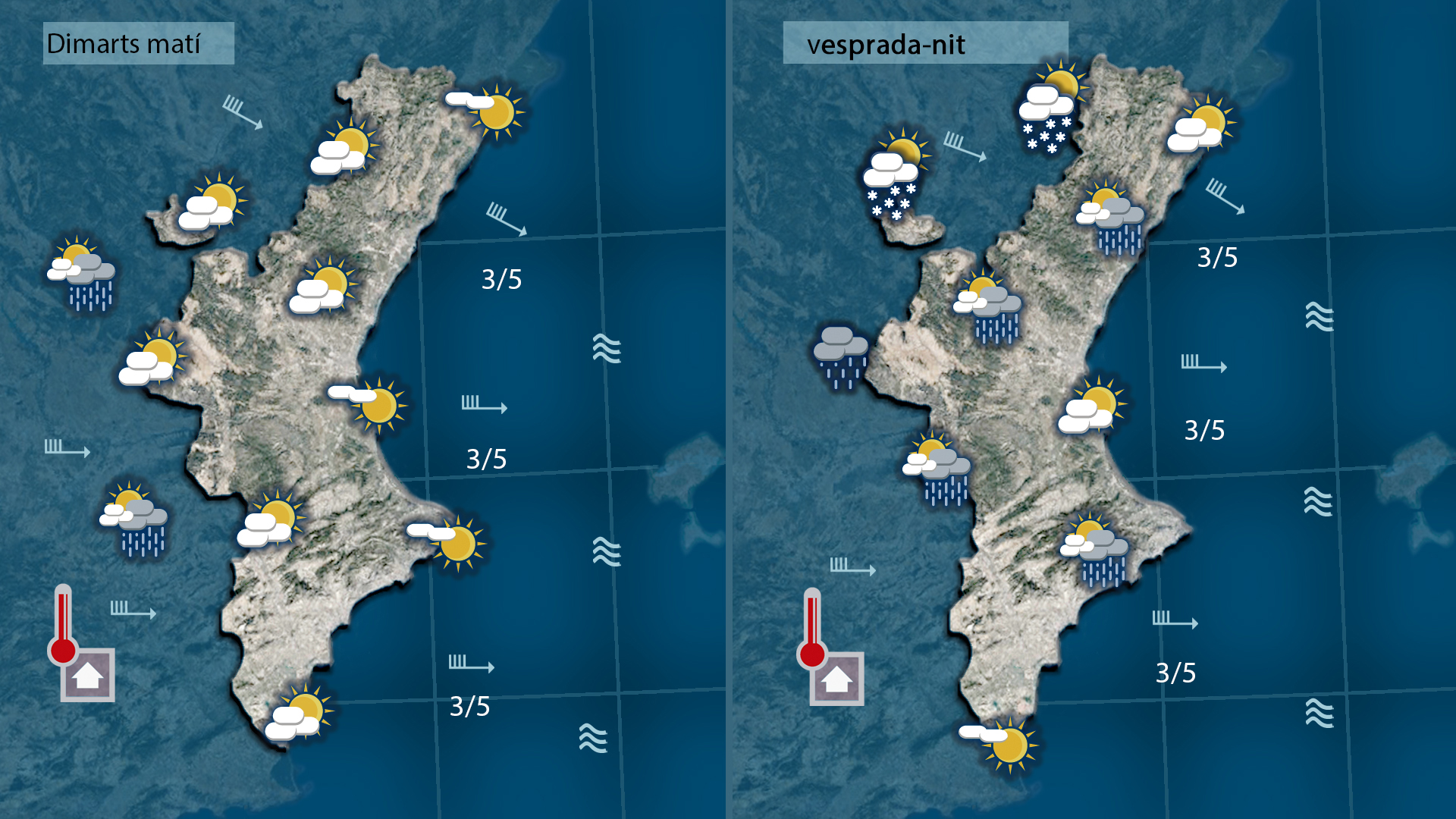 Pocs canvis per a demà dimarts en bufar el vent que mantindrà les temperatrures tan altes com les de hui encara que a poqueta nit i al nord tindrem un descens tèrmic que farà que les precipitacions que puguen registrar-se siguen de neu al voltant dels 1.200 metres.