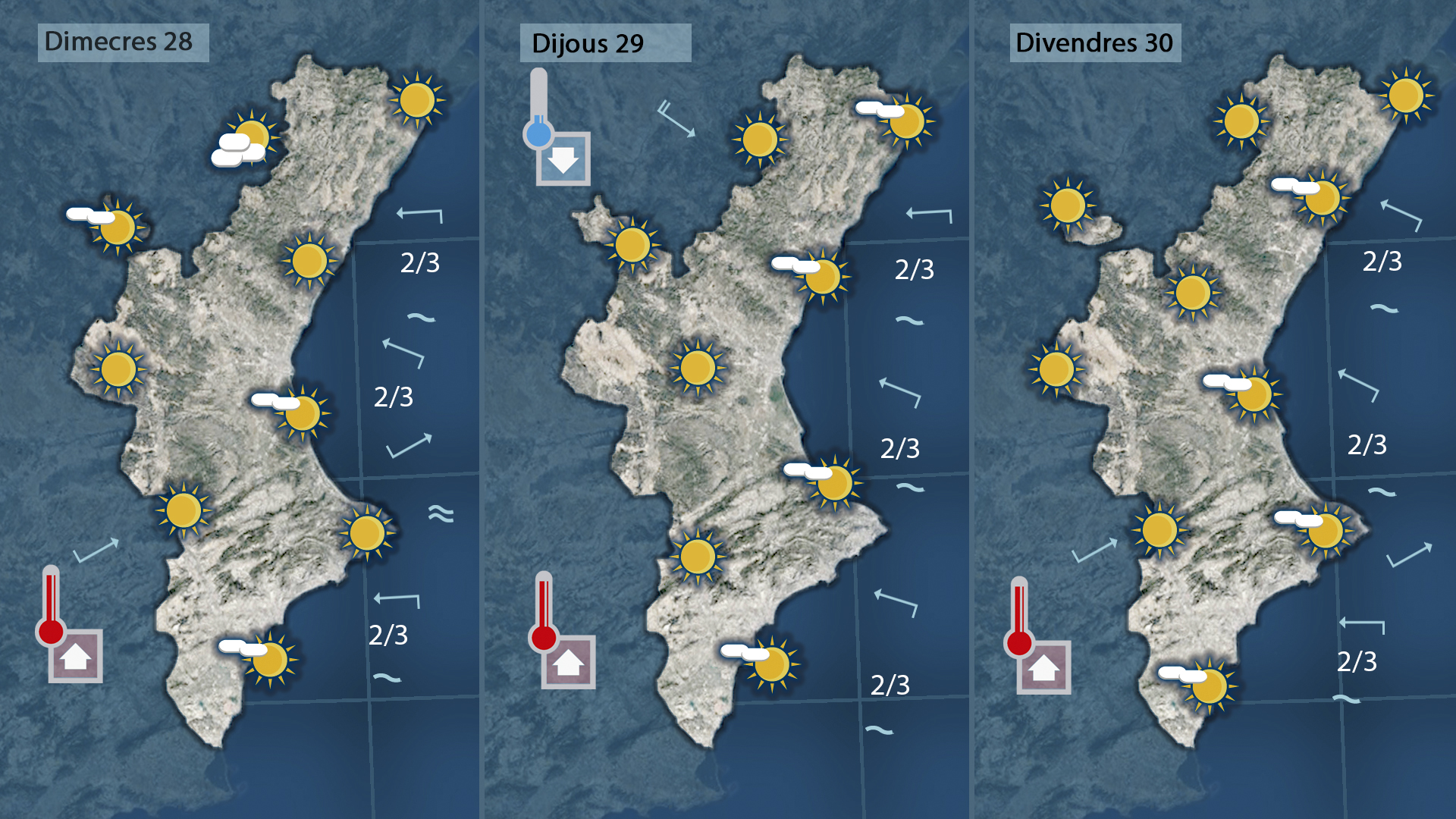 I a partir de dimecres comença l’ascens tèrmic que portarà els termòmetres a valors estivals entre dimecres i dijous es registraran valors de 35 graus a les comarques més centrals i entre divendres i dissabte s’aproparan als 40. A la costa farà calor però s’agrairà la brisa que a migdia refresca l’ambient i sempre fa més suportable la calor