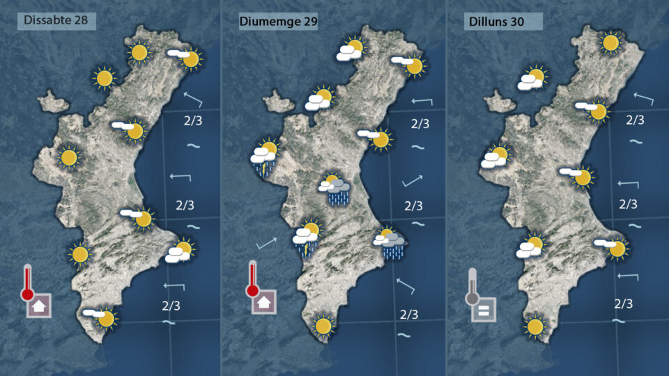 I la calor també vol ser la protagonista del cap de setmana. Només cal contemplar una remota probabilitat diumenge de vesprada nit, la resta del cp de setmana qui puga que el passe dins la mar o a remulla a la piscina