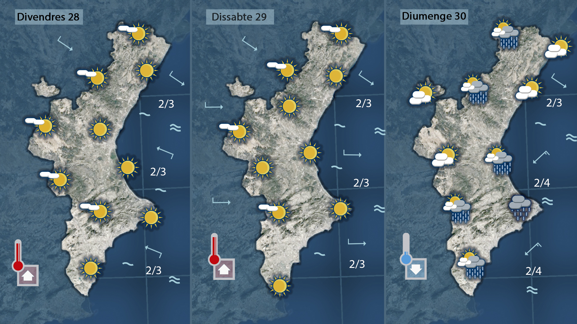 A l’espera de poder conformar els canvis que podeu vore al mapa de diumenge tant divendres com dissabte les temperatures continuaran l’ascens que ja hem notat les últimes hores arribant les temperatures dissabte de nou als 20 graus a la costa, al centre i al sud de la Comunitat.
