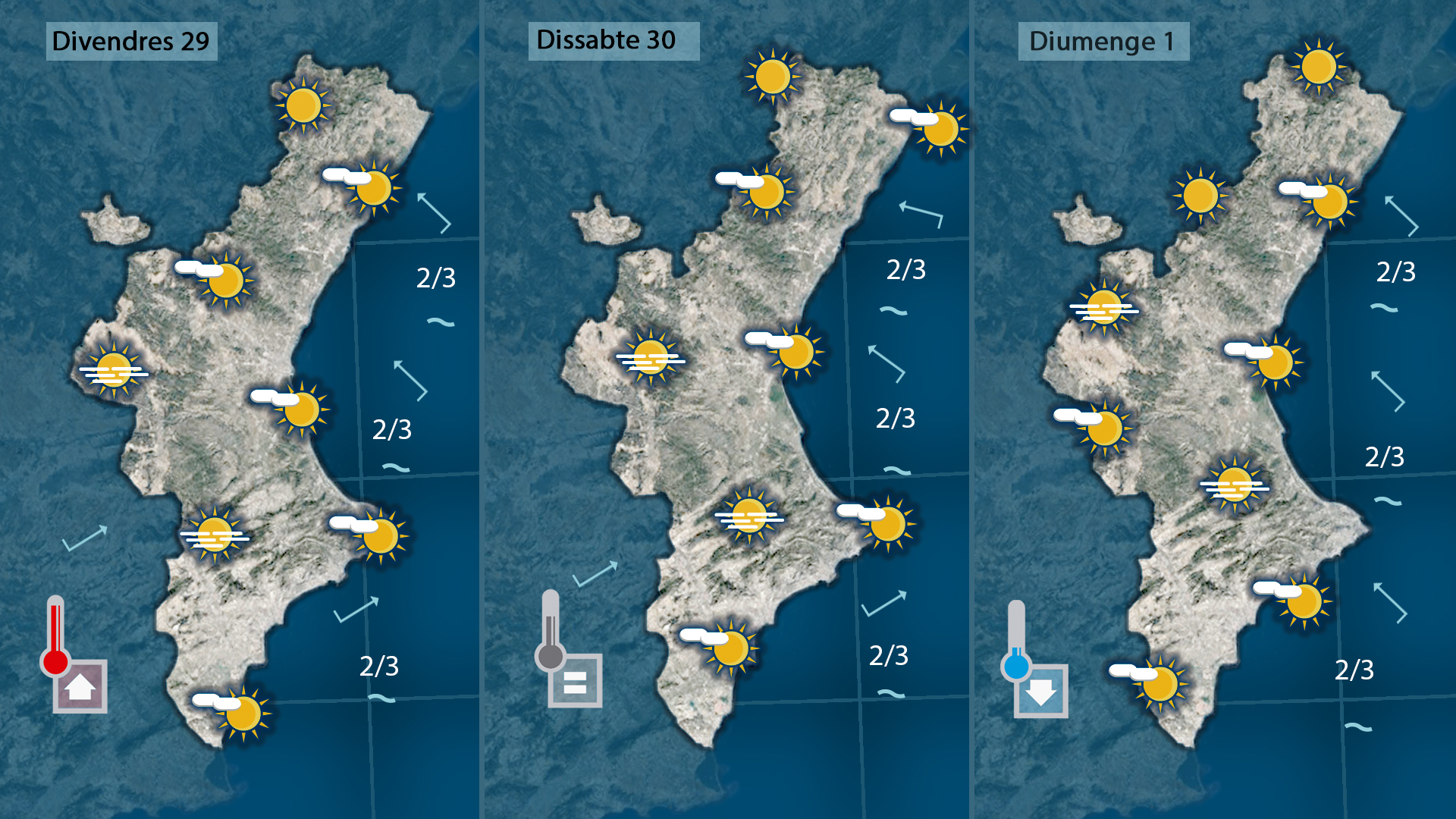 Demà dijous tampoc cal esperar molts canvis ni en l’aspecte del cel no tampoc en els regsitres que marcaran els termòmetres perquè grau amunt, grau avall quedaran com les de hui