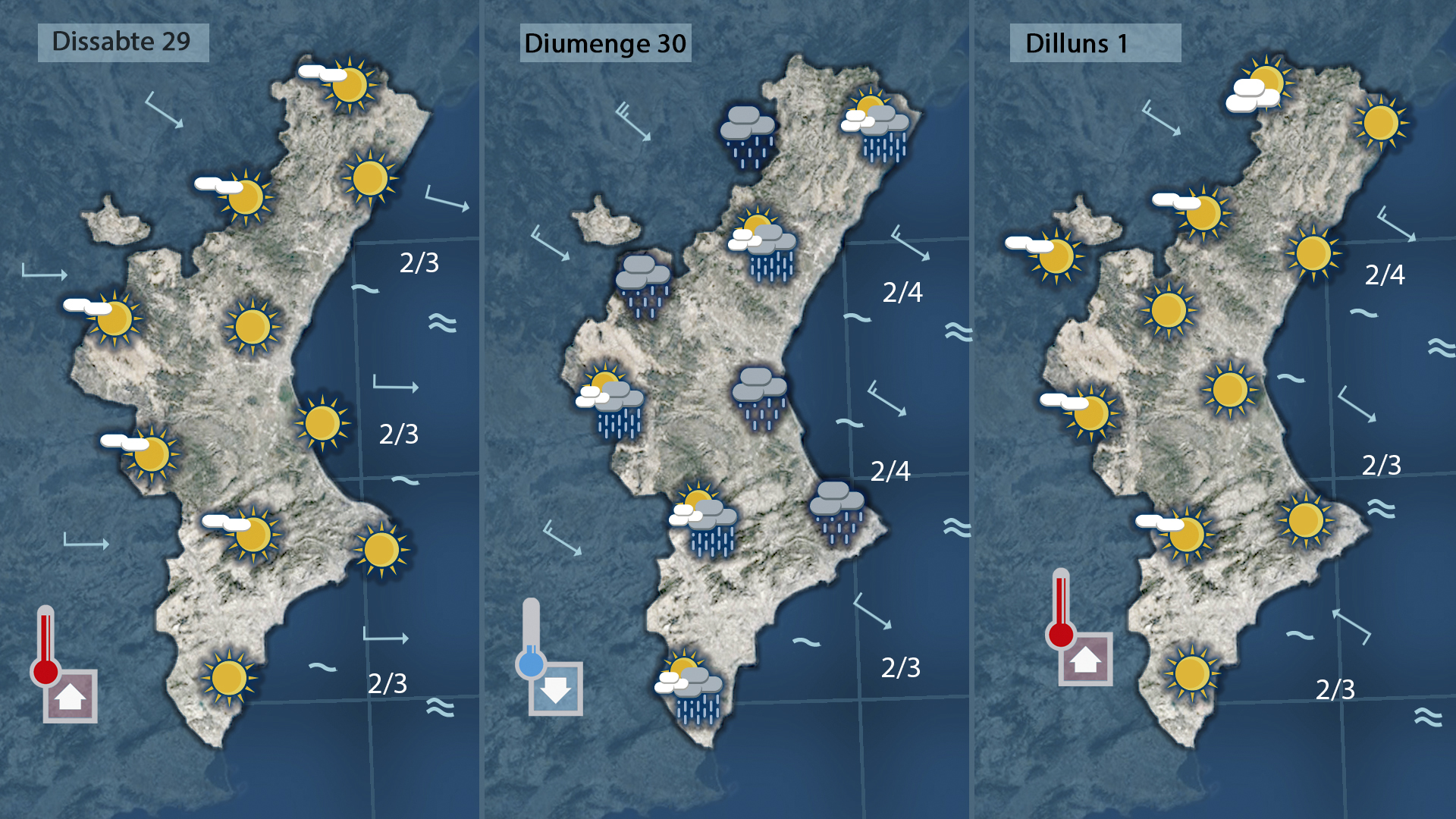 El cap de setmana presentarà dos cares per acomiadar el novembre: dissabte amb vents fluixos de ponent i temperatures més altes, i diumenge amb pas de núvols ruixats dèbils i dispersos i temperatures més baixes.