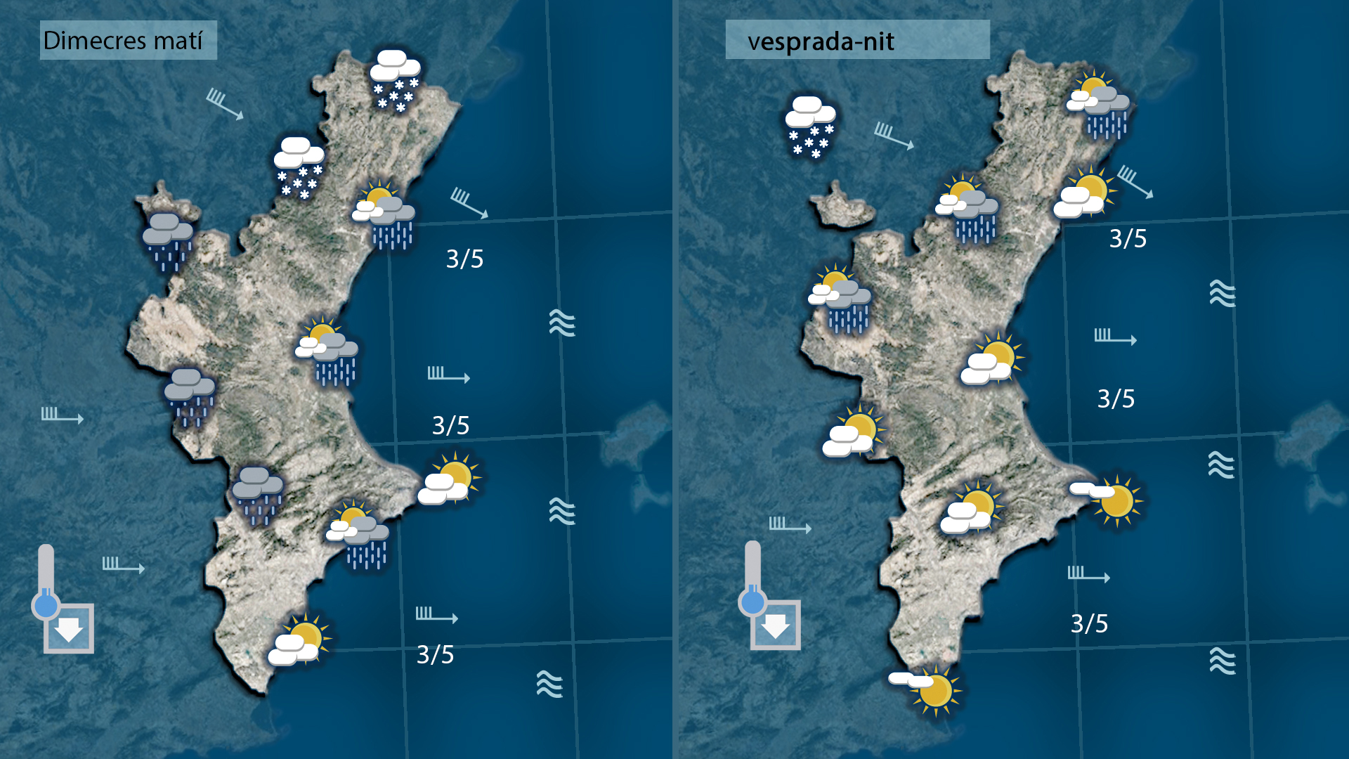 Comencem el dia amb el cel carregat de núvols i amb un notable descens térimc que farà baixar la cota de neu des de 3ls 1.300 metres fins als 800 a primera bora del dia per a trnar a pujar dels 1.000 metres de cara a la vesprada.