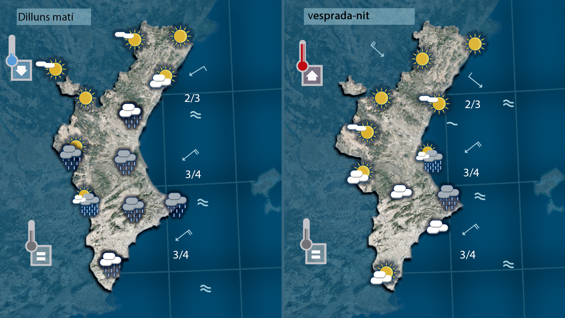 L’avís per pluges localment intenses l’arrosseguem d’ahir diumenge a les zones més costaneres del centre de la Comunitat on pot ploure intensament fins a migdia