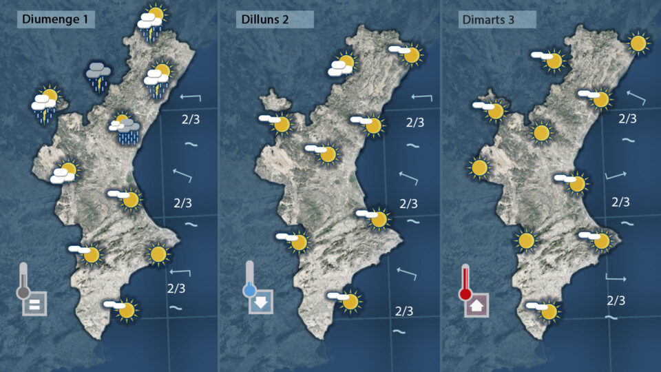 Dia rere dia van pujant les temperatures. Va consolidant-se l’anticicló i al mateix temps realimenta la massa d’aire càlida que tenim al damunt des de fa uns dies però just al mateix temps vol deixar-se sentir una lleugera inestabilitat, un cop d’aire fredc al nord de la Comunitat que barrejada amb la calor acumulada dut¡rant la setmana portarà tronades ben bé des de hui fins diumenge de vesprada.