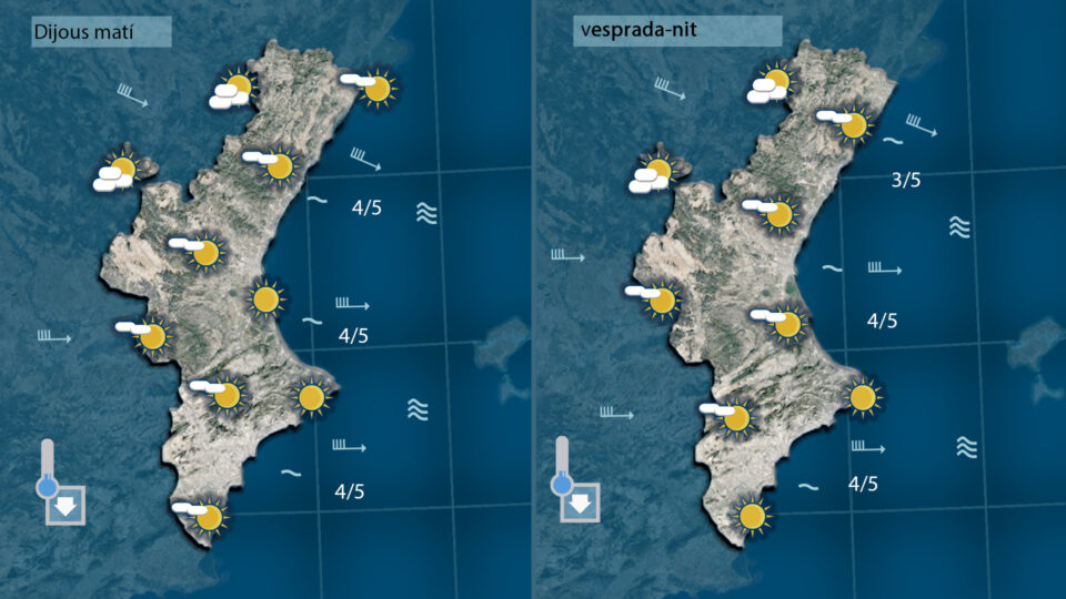 El vent anirà demà a la baixa. Aemet mantindrà els avisos per vent fins a migdia fins a migdia quedant prou més fluix de vesprada amb temperatyres un poc més baixes que els de hui.