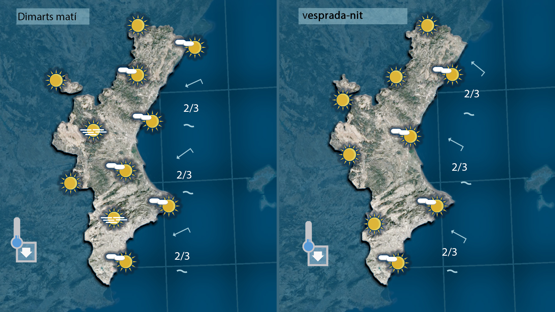 Demà el dia començarà tan fresc com hui però al centre del dia podrem disfrutar d’algun grau més amb boires matinals i núvols baixos a primera i última hora en punts de la costa i a les zones més fondew