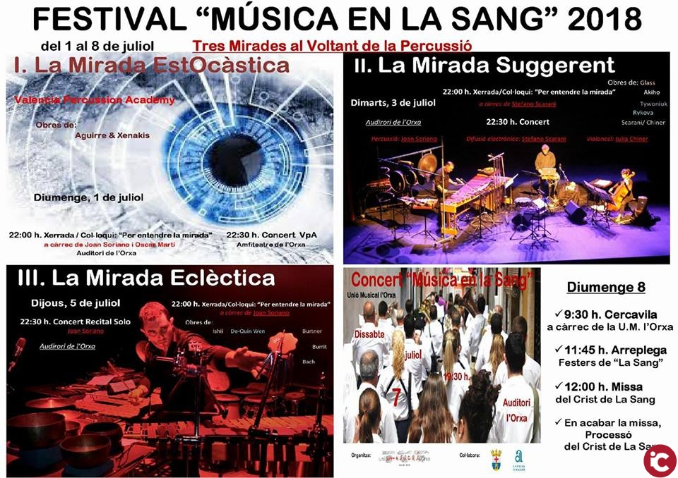 L’Orxa celebra aquesta setmana la XVI edició del Festival ‘Música en la Sang’, organitzat per la Unió Musical de l’Orxa i l’Ajuntament, amb el suport de la Diputació d’Alacant, i centrat aquest any en la percussió.