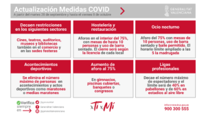 En concreto, decaen las restricciones en cines, teatros, auditorios, museos y bibliotecas, así como en otros sectores como el comercio, guías turísticos y sedes festeras, teniendo en cuenta siempre el mantenimiento de las medidas generales de cautela, seguridad e higiene.