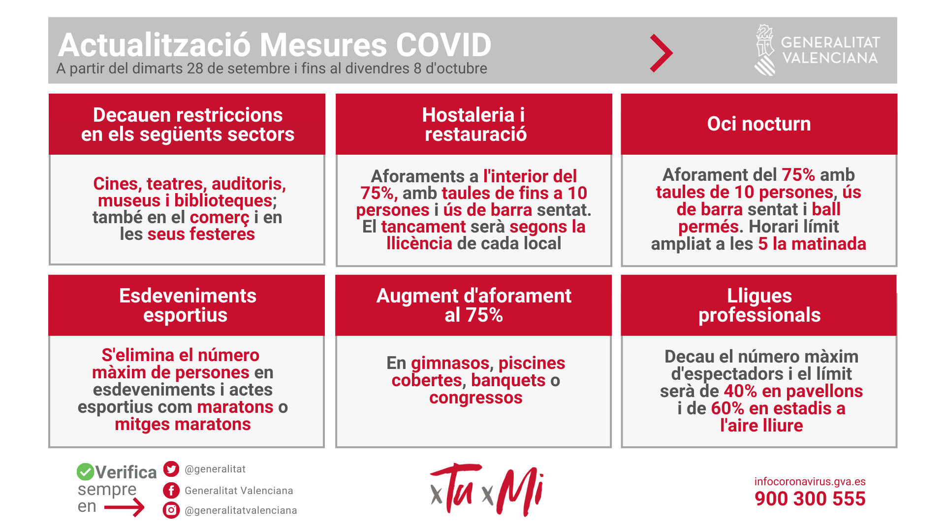 - Ocio Nocturno: Podrá ampliar el aforo del 50 al 75%, con mesas de 10 personas, uso de barra sentado, se permitirá el baile delante del sitio asignado. Horario ampliado a las 5 de la mañana.