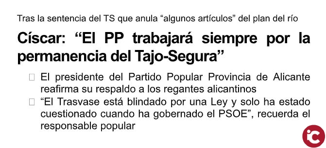Císcar responde de esta manera a la sentencia del Tribunal Supremo, dada a conocer este sábado, que anula “algunos artículos” del Plan Hidrológico del Tajo. El responsable popular entiende “la intranquilidad de los regantes ante el futuro del Trasvase Tajo-Segura y asegura que la permanencia de Pedro Sánchez en el Gobierno de España no sería una buena noticia para nuestros agricultores, dado su declarado perfil antitrasvasista”. El presidente de los populares alicantinos señala que “desde el PP siempre vamos al lado de las comunidades de regantes de la provincia de Alicante y defender sus intereses”, insiste.