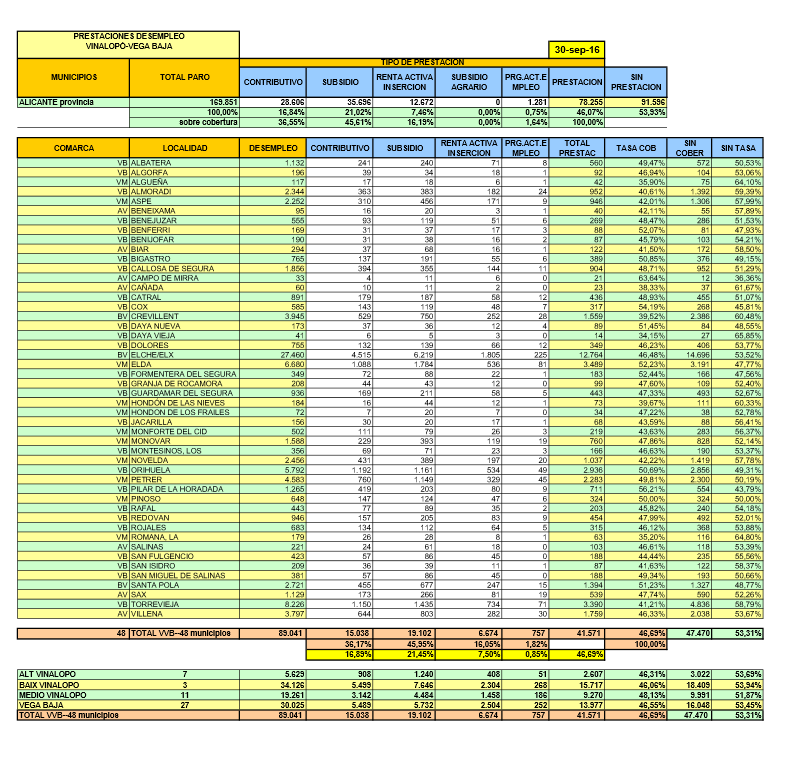 De los datos de dichos informes, se puede extraer unas conclusiones sobre los datos, la primera es que la cobertura de las personas que están en DESEMPLEO, a nivel Vinalopó-Vega Baja, el dato de cobertura del 46,69% del mes de Septiembre, por lo que en consecuencia baja sobre el mes de Agosto un -2,19%. Con estos datos la situación es la siguiente: