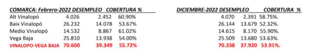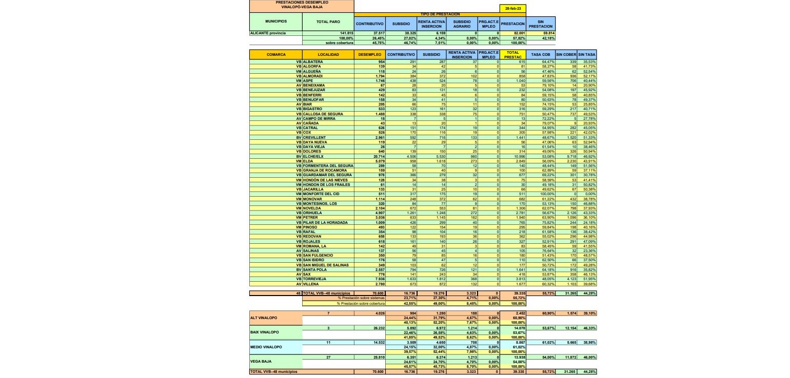 En el mes de Febrero, la cobertura de las personas en paro registrado en el ámbito de Vinalopó-Vega Baja ha sido de 39.335, lo que supone el 55.72% de cobertura.
